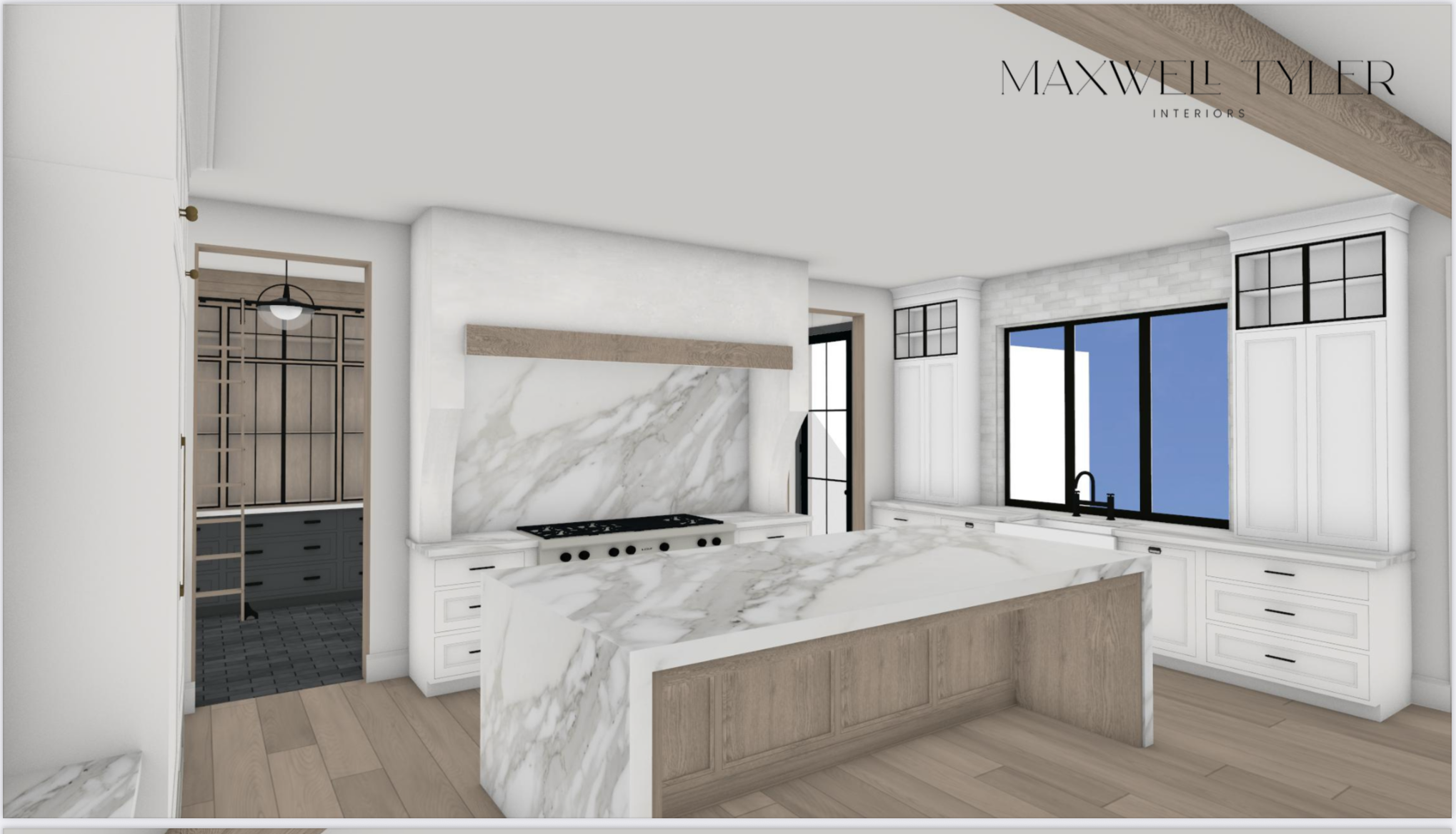 render a modern kitchen interior with a bright and airy atmosphere countertops and backsplash smooth polished white marble with light grey veining for a luxurious appearance cabinets crisp white with black hardware adding a sleek contrast flooring warm light oak wood for a natural and inviting feel walls and ceiling soft eggshell white to enhance brightness windows large black framed for a contemporary touch letting in ample natural light accents minimalist with subtle metallic elements in gold and black for added sophistication overall ambiance modern elegance with a focus on simplicity and natural light