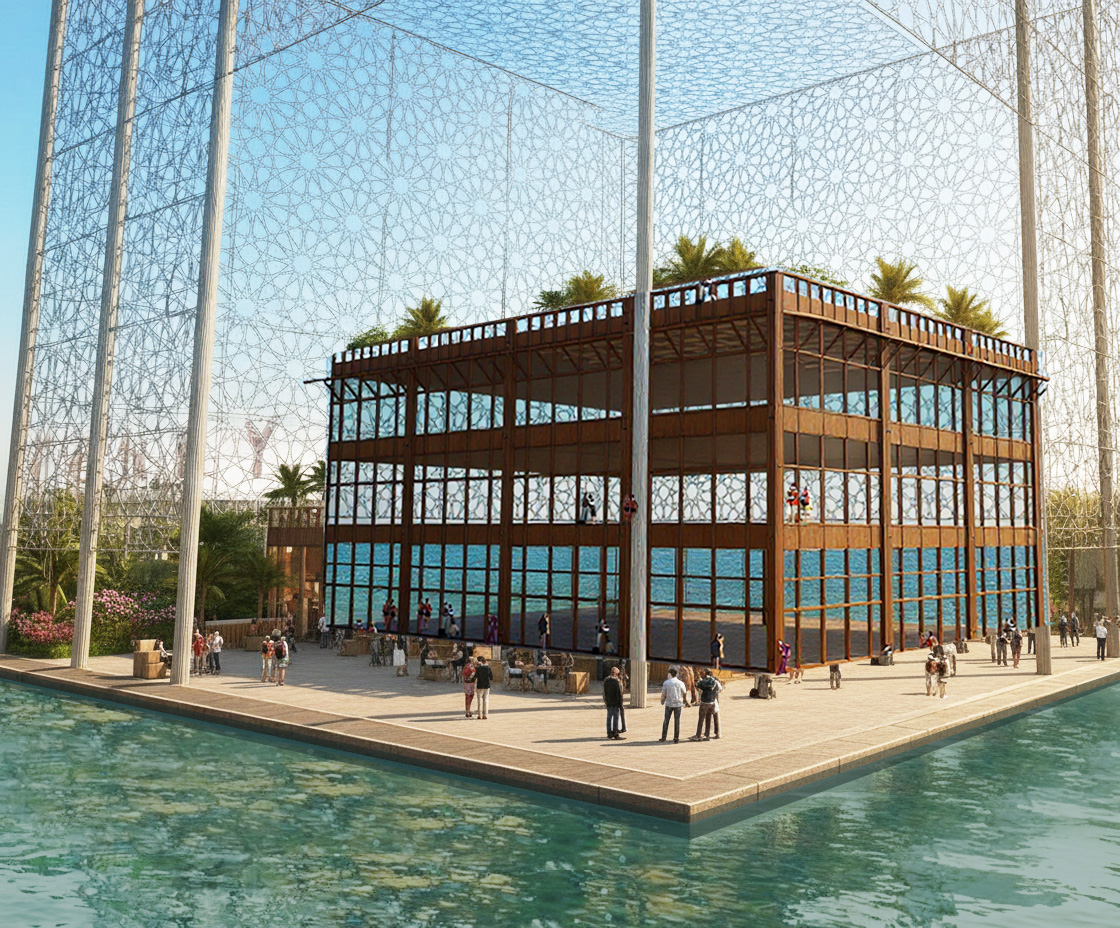 it is a sunny day in a tropical environment keep everything exactly as it is in the input image preserving the original morphology scale and volumetry inside the wooden building show a lot of activity on the ground floor there are restaurants with warm lights and people dining on the first and second floors there is a more elegant and intimate vip area with a warm and refined atmosphere add a glass handrail between the platform and the water there are people in the deck seating meeting and enjoyng the day all other elements must remain unchanged
