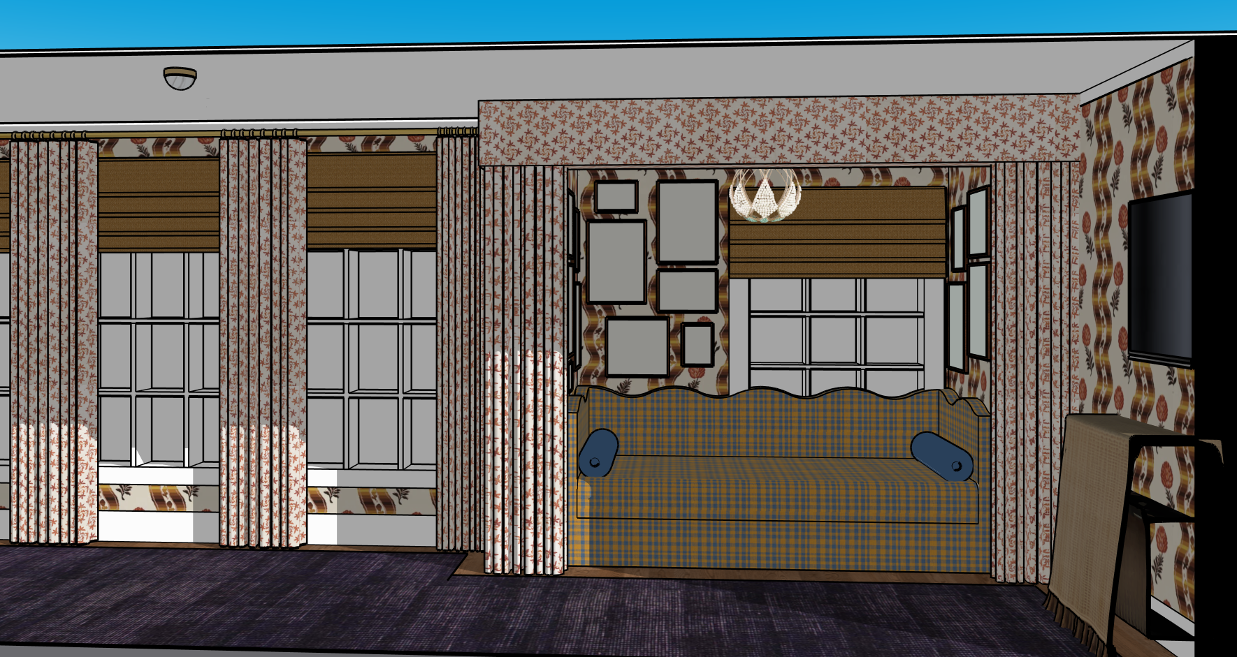 the uploaded image is a finished sketchup interior scene with final materials already applied preserve the camera angle room layout and furniture placement exactly as shown all materials must remain unchanged including the fabric the upholstery the rug the fireplace surround the mantel and the wood flooring do not reinterpret fabrics colors or textures enhance the image by adding realistic lighting shadows and material depth only to create a photorealistic architectural rendering strict preservation keep all fabrics patterns colors and materials exactly as shown material fidelity required warm lighting
