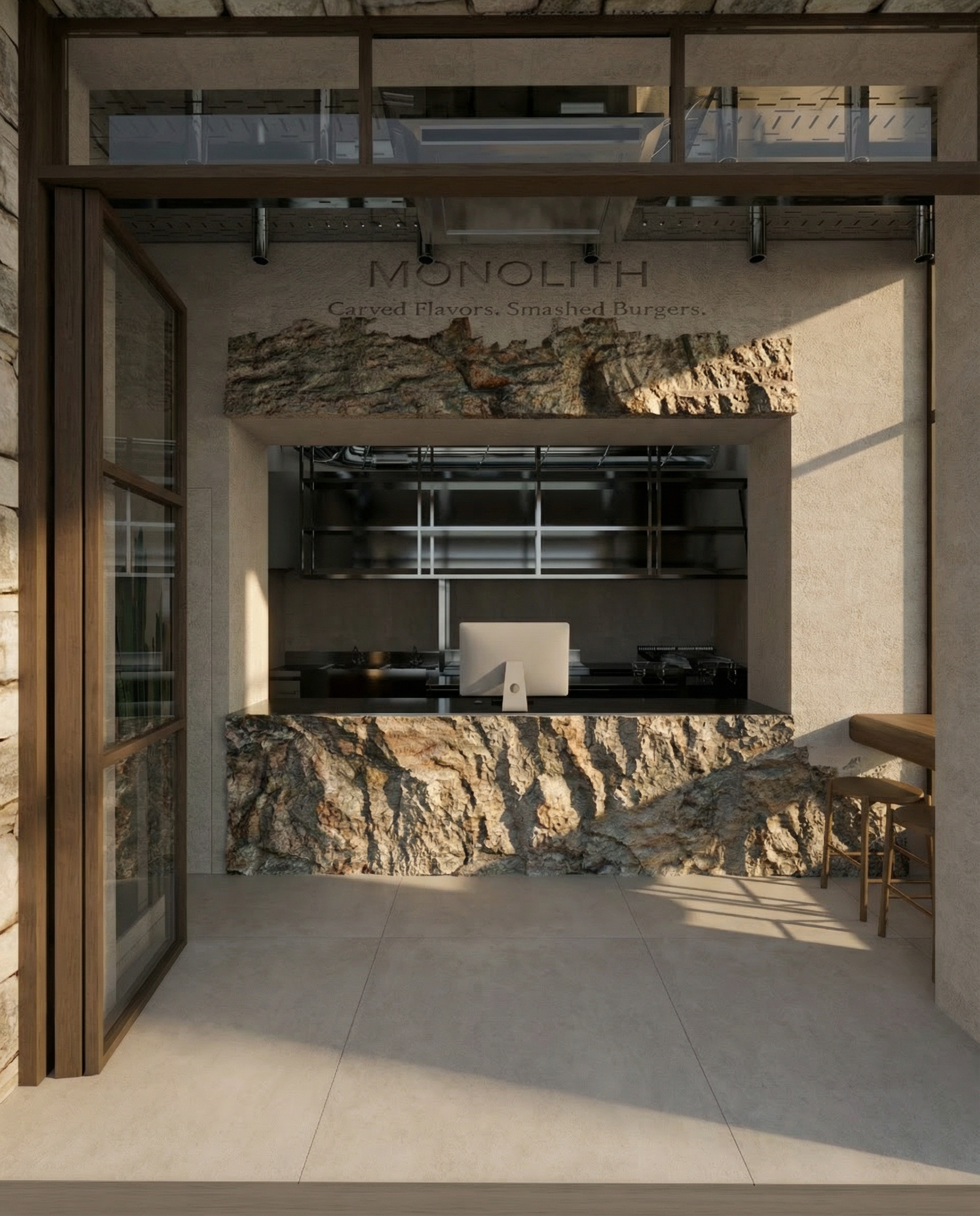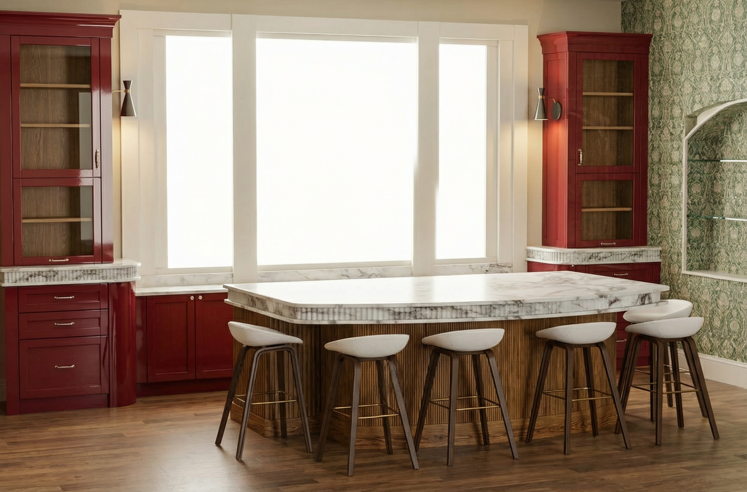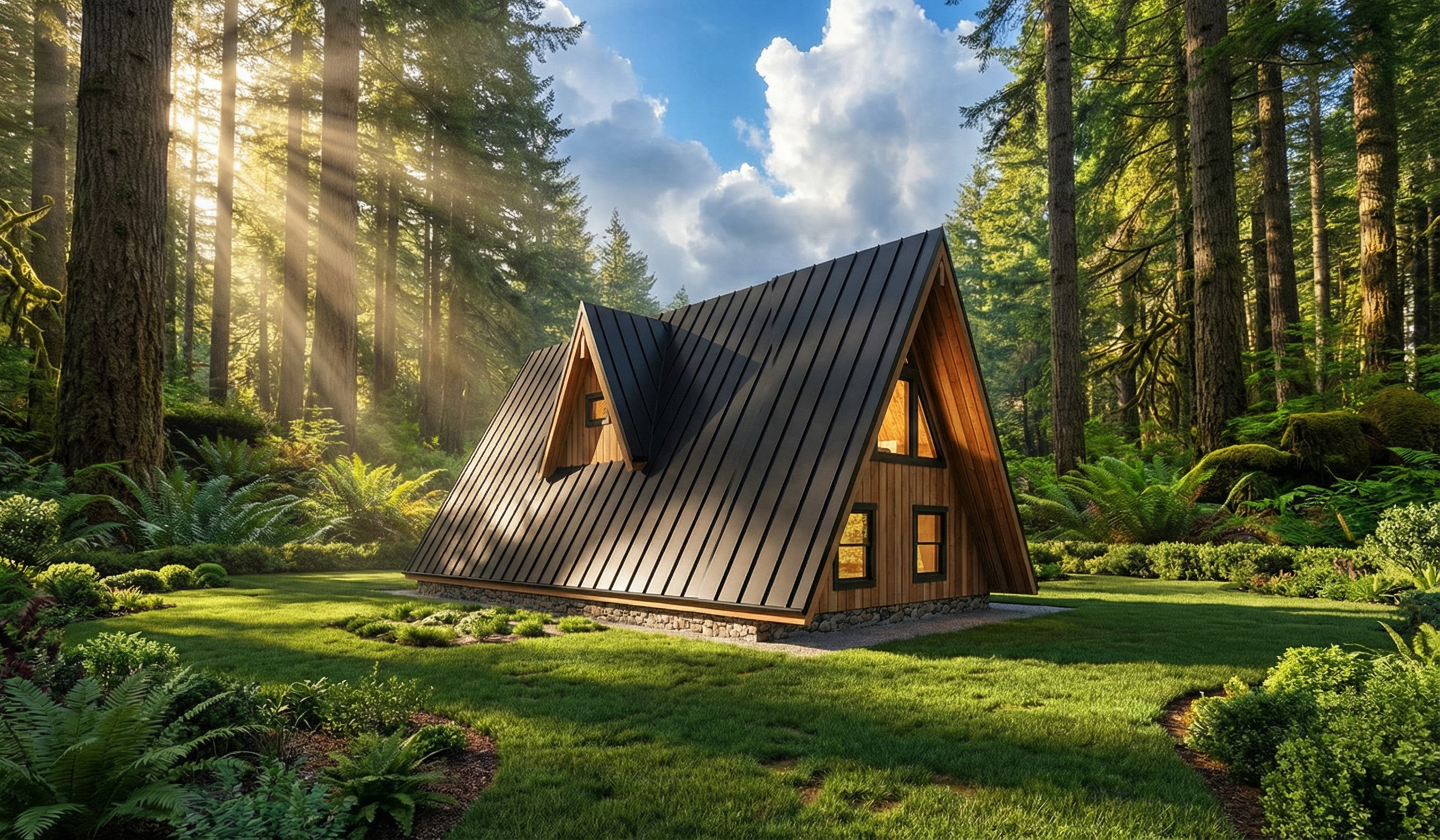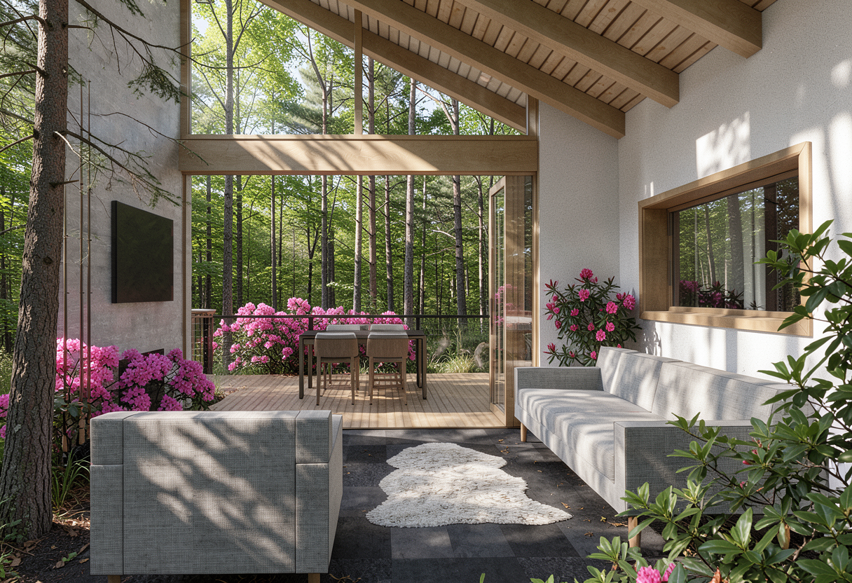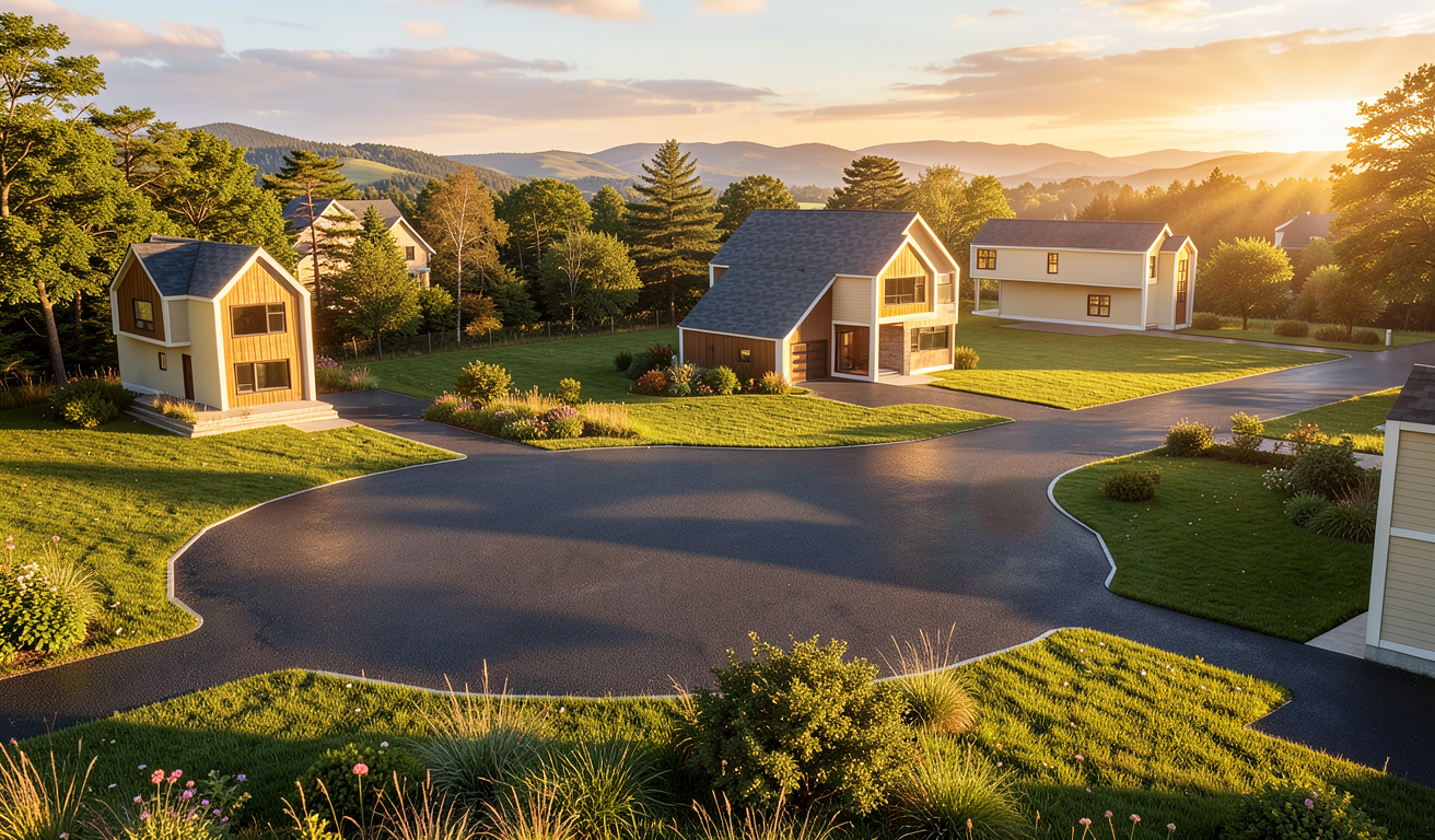 ight beige horizontal siding white contrasting trim around entire house and windows large clear glass windows with no grids no muntins no divided lights deep red shutters cedar shake siding on all dormers including dormer above garage board and batten siding on front porch and garage side elevation dark wood front entry door matching dark wood garage doors dark gray asphalt shingle main roof with curved metal accent roof elements professionally landscaped front yard with lush green lawn structured shrubs minimal flowers warm interior lighting visible through windows soft pink evening sky with subtle sunset glow photorealistic architectural rendering realistic materials natural shadows balanced exposure