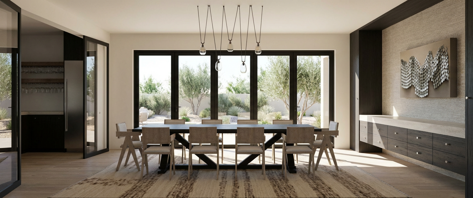 in this hallway add a ceiling with recessed downlighting as well as 7 healthcare rated surface mounted sliding door system on each side at the end there is a door to the outside