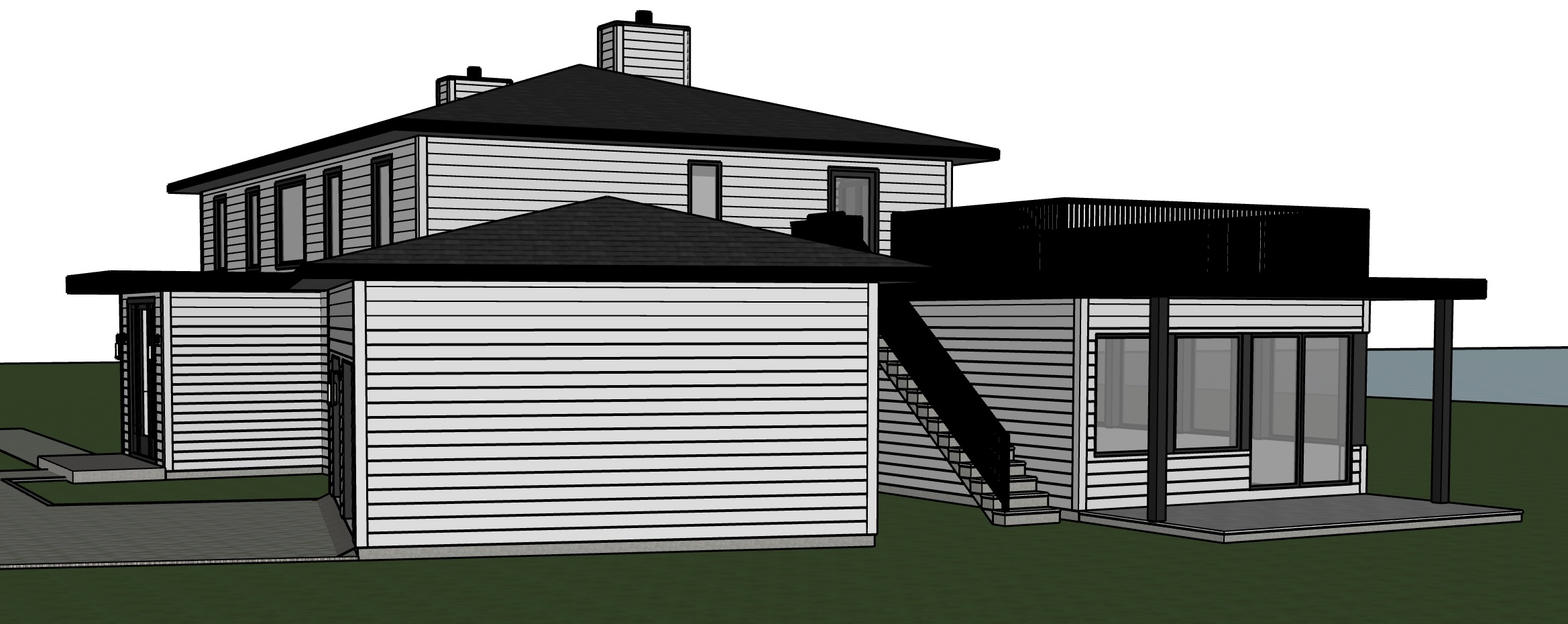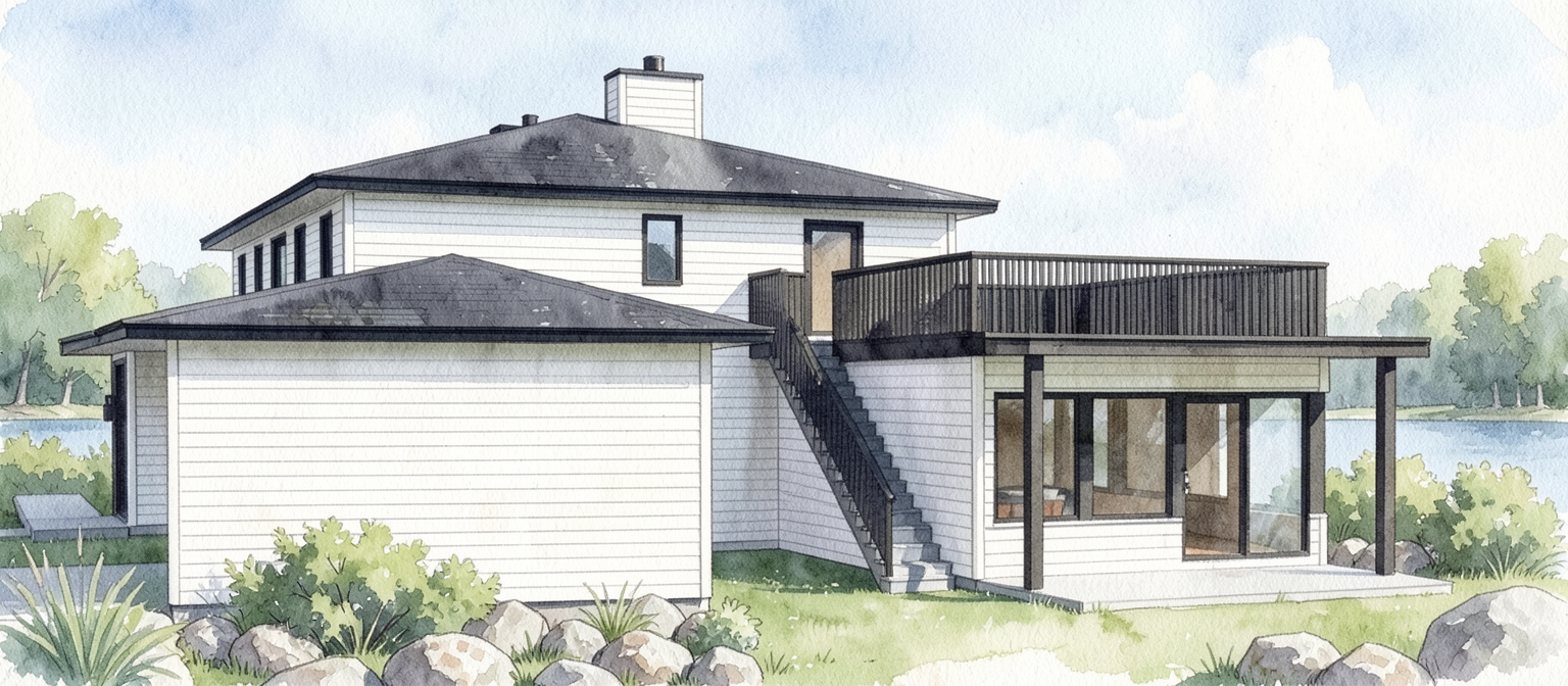 watercolour rendering no changes to architecture in image provided maintain all roof shapes roof over entry door is flat white siding for exterior roof are black window frames and doors are black add some subtle rocky landscaping local to qc lake behind house in the distance do not add car keep draw way and walkways as shown