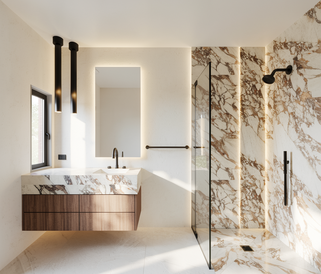 please make a realistic render with warm modern tones and black window frames set in a residential neighborhood with some large mature trees in the background keep existing material showing natural brick and light board and batten siding dark slate roof and contemporary accents show a path leading to the front steps show some nice landscaping and a street to the far right below the property with a retaining wall next to it