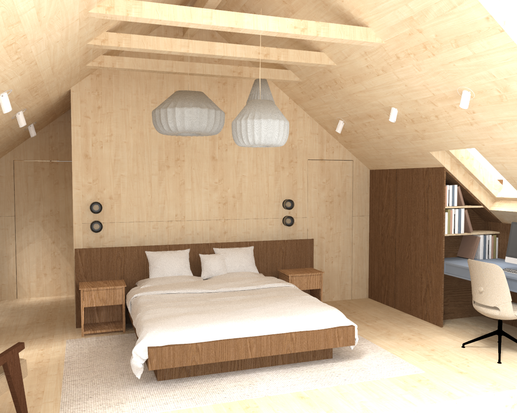 the room is built out of clt panels so the walls and ceiling is very light wood structure