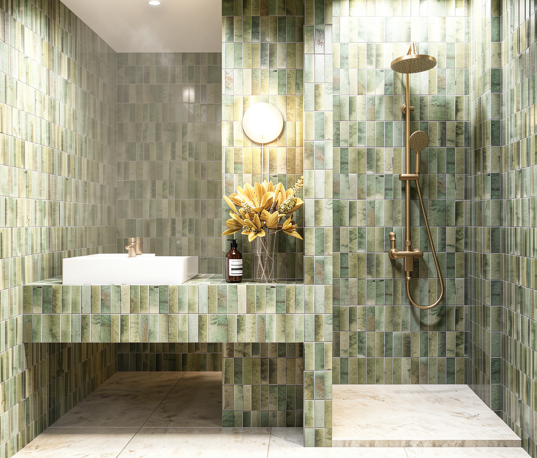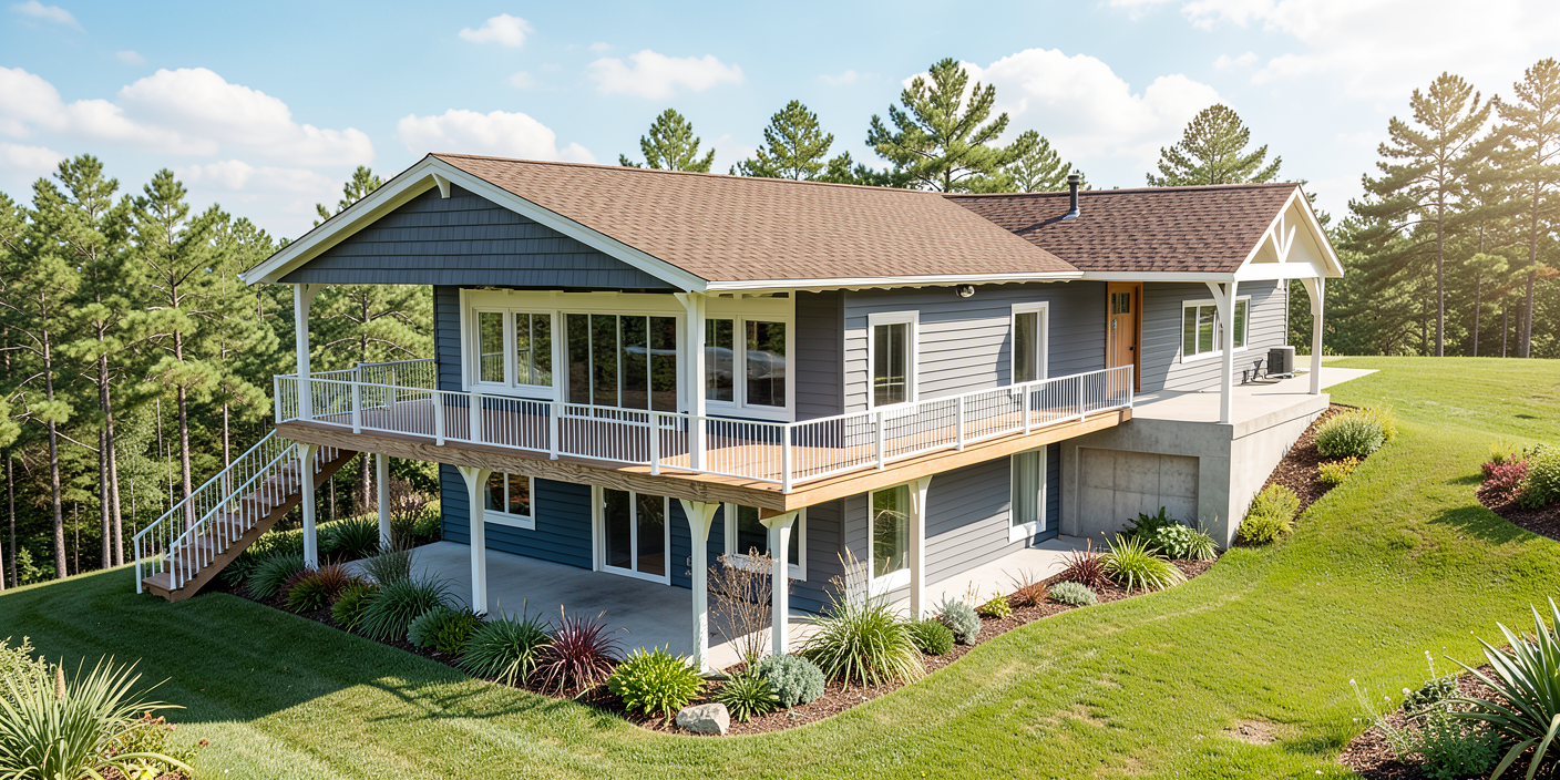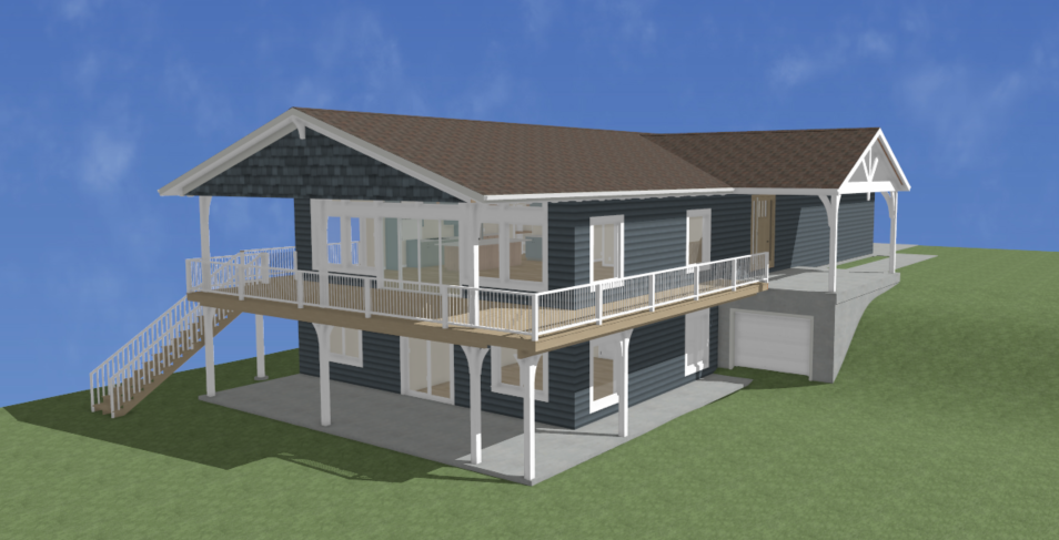 a dark grey blue cabin set on a slight uphill slope pine trees scattered behind it a manicured lawn with minimal native plants a brown shingle roof and a light brown front door and deck the basement deck is concrete a white garage door a soft blue sky with white clouds that softens the scene