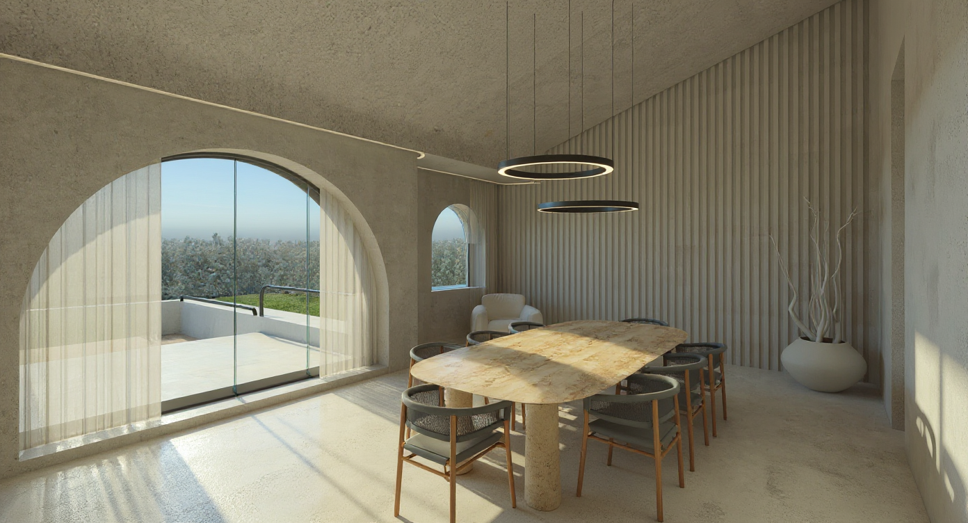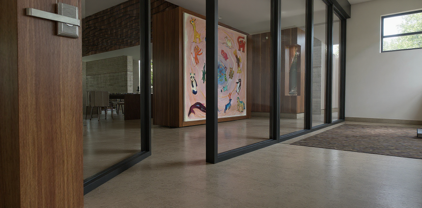 6pm view with indirect lighting and spot light in hallway and on top of painting and sculpture