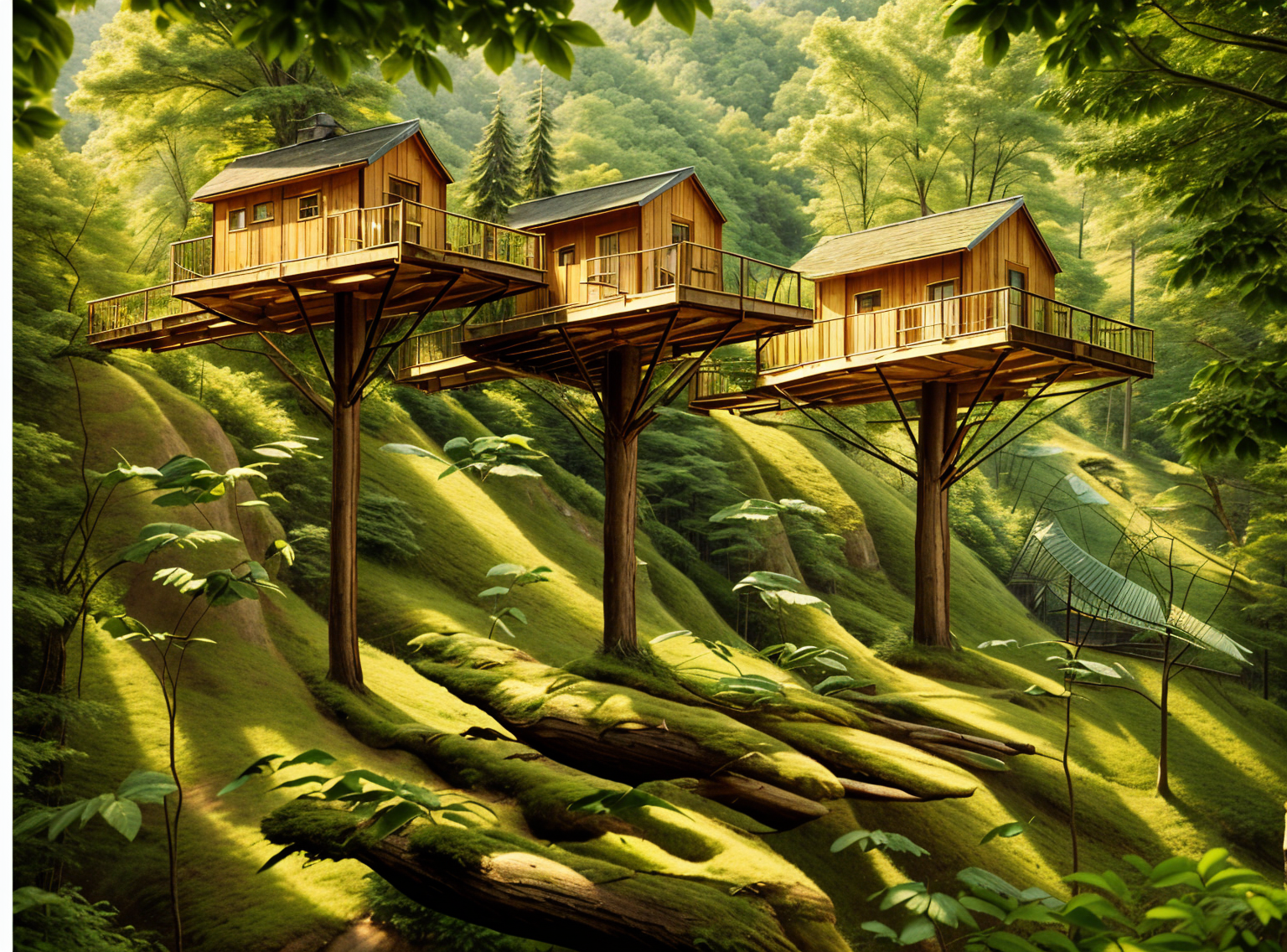 three idyllic wooden treehouses perched on one large teel tube overlook a lush green hillside the treehouses are painted in a warm golden honey hue reflecting sunlight with dark brown roofs their wooden balconies are emphasized with deep rich mahogany railings the hillside beneath is an alabama summertime woods with vibrant lush green understory with shadowed patches enhancing the depth and realism in the background dense dark green forests stretch into the distance creating a sense of serene wilderness soft dappled sunlight filters through casting gentle shadows and creating a tranquil peaceful atmosphere architecture