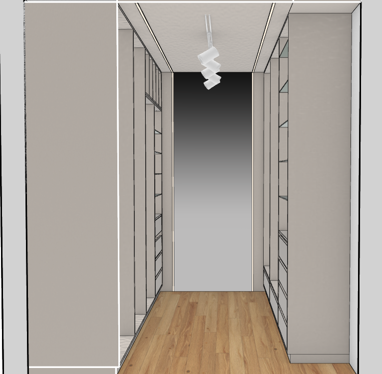 haz un render realista de este walk in closet no cambies nada del layout no agregues elementos diferentes al mobiliario todo va sin manijas con ranura fingerpull agrega ropa en colores neutros en los tubos de colgar y sweaters polos doblados en las partes de repisa la iluminaci n es c lida hay una cinta led que va del techo al espejo por ambos lados los spotlights ser an blancos peque os