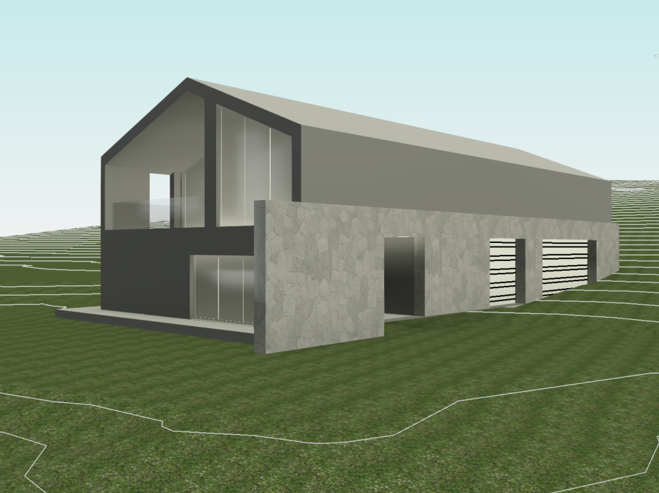 modernist exterior shot add mountains in background and ferns and spruce trees architecture