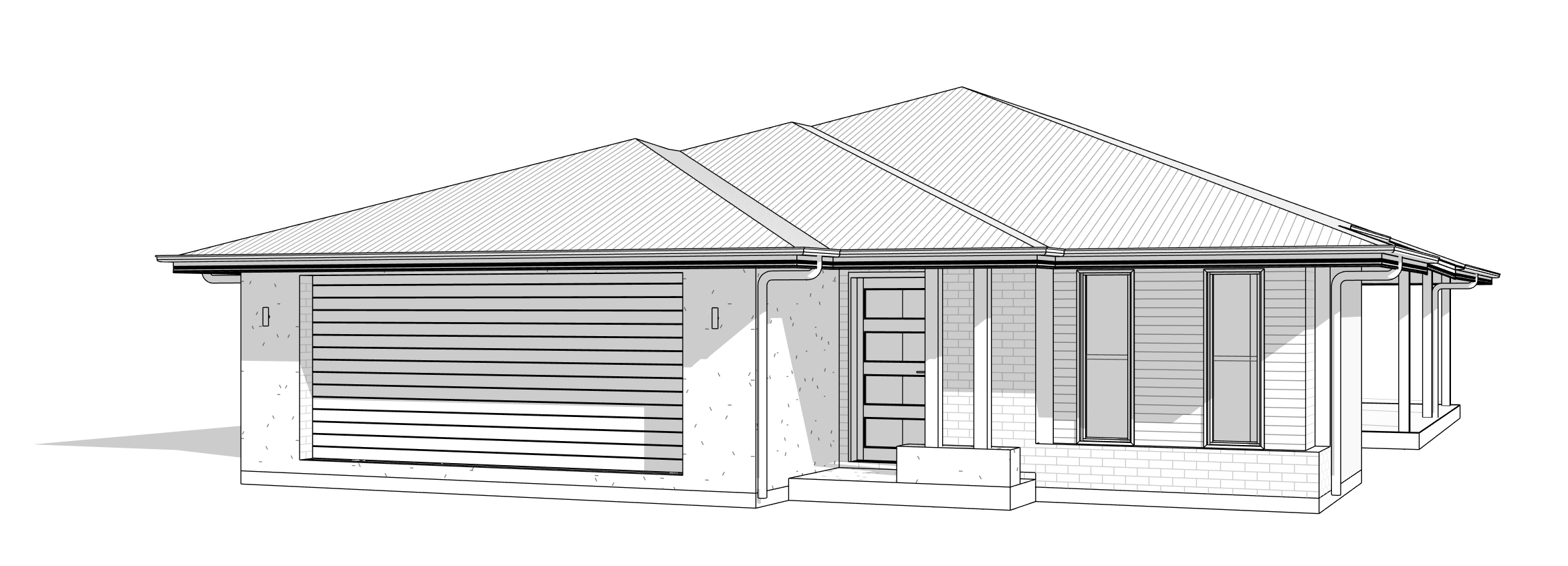 exterior shot create a highly detailed and realistic render based on the following specifications 1 3d design image use the provided 3d design image as the base model do not alter the model including the positions of windows and doors 2 setting place the model in an australian urban environment the background should feature native australian bush flora capturing the essence of the local landscape 3 lighting the scene should depict a sunny day position the sun behind the camera to create realistic shadows that enhance the depth and details of the model 4 front yard design the front yard with a lush grass lawn incorporating native australian gardens that complement the overall aesthetic 5 driveway the driveway should be rendered as broom finished grey concrete providing a modern contrast to the natural elements of the yard 6 house facade the facade of the house should consist of a mixture of materials tan coloured brick dark grey coloured weatherboard white render ensure that the textures and finishes are realistic and visually appealing 7 roof material use colorbond corrugated profile for the roof specifically in the southerly colour ensuring that the material reflects light appropriately 8 front door the front door should be depicted as dark wooden with realistic grain and texture enhancing the inviting appearance of the entryway ensure that all elements are rendered in high resolution maintaining attention to detail in textures colors and lighting to create a lifelike representation of the described scene architecture