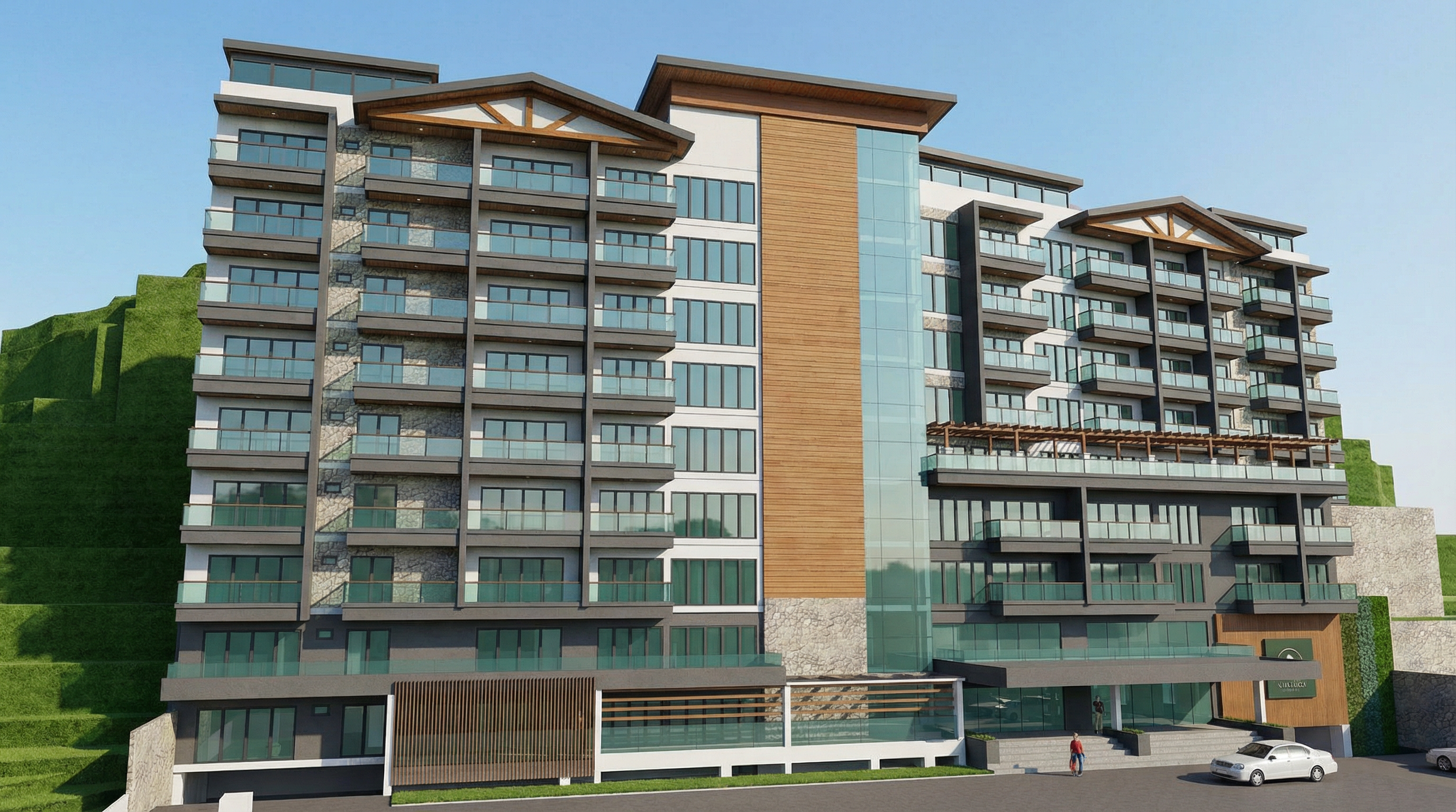grainy watercolor render of classic styled home with green paint include trees and mountainous alaska environment in the background simple driveway and walkways in front of the home