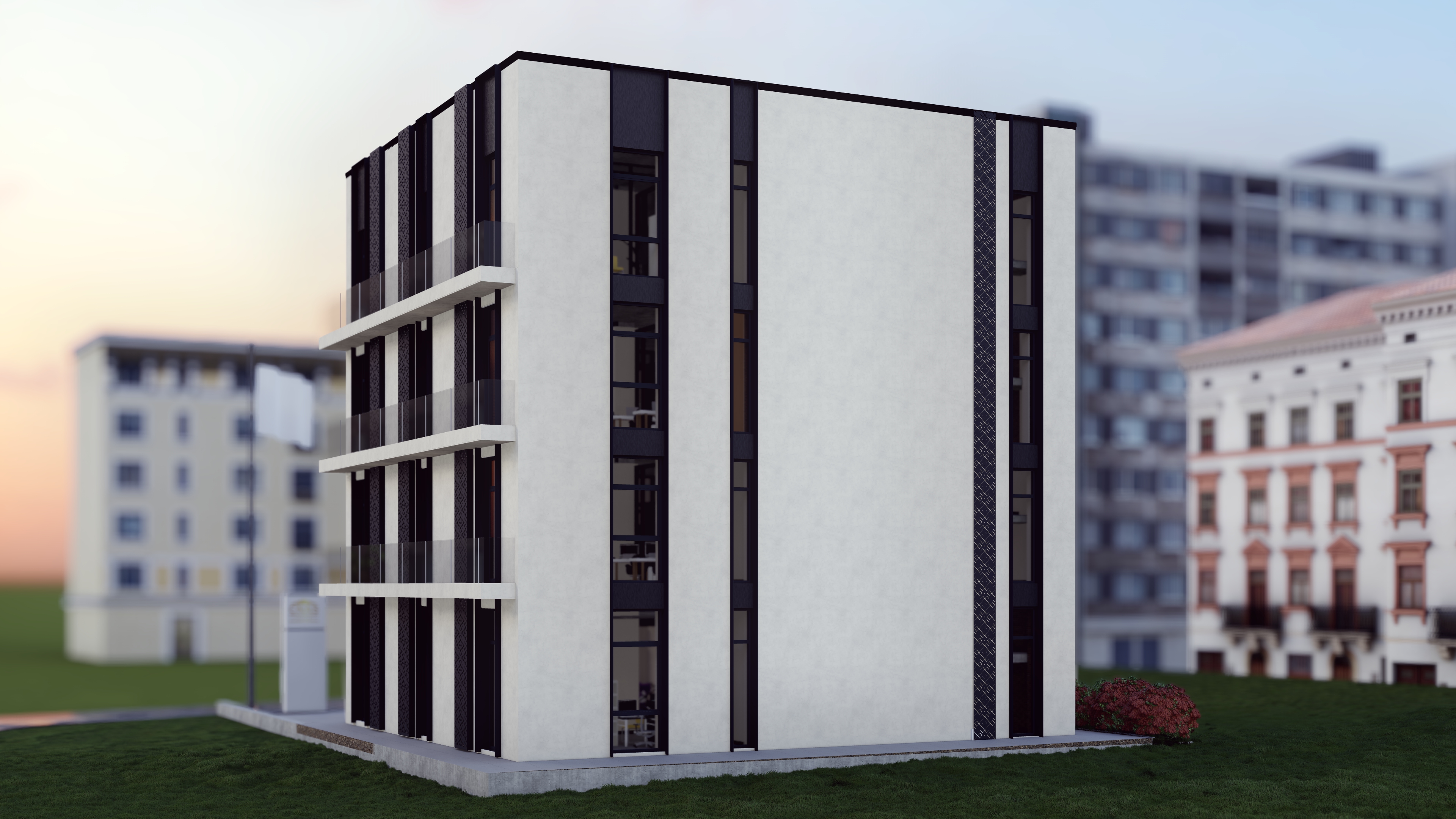 do not change any other details add interior lighting visible through the windows apply marazzi grande resin look bianco ceramic facade texture divide the facade into large ceramic panels with clean joints