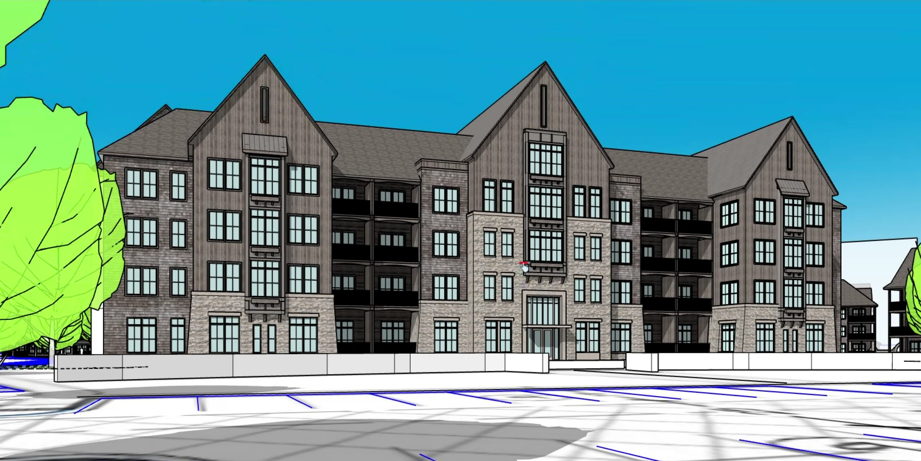 grainy watercolor render of timber frame building with reclaimed wood siding and stone wainscot watercolor trees and urban environment in the background extensive watercolor landscaping surrounding the building