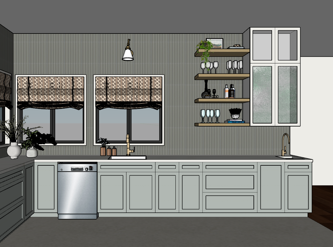 do not change original colors or materials please add a garden in the back windows only the upper right cabinet is supposed to be white with glass doors the lower cabinets are light sage green and the backsplash is light slate blue