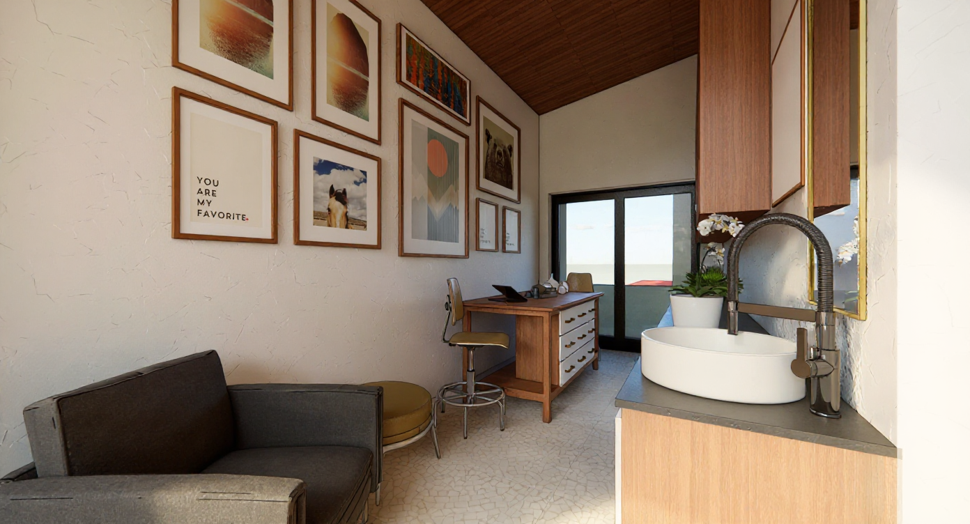 third level terrace render keep existing furniture and layout enhance textures of table chairs flooring and surroundings for a realistic high quality appearance add garden themed decor on the table small plants flowers modern planter include neighboring houses in the background considering the height of the building realistic materials lighting and shadows lifelike scene