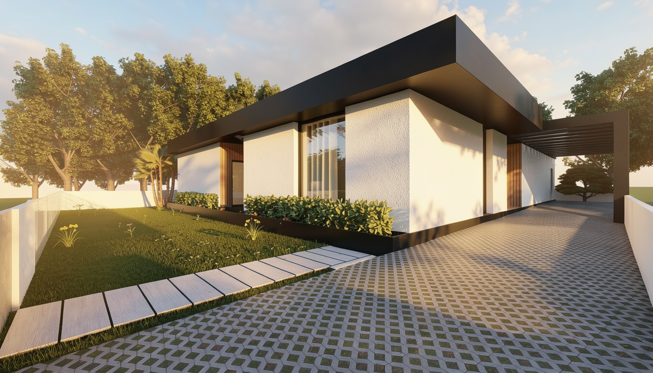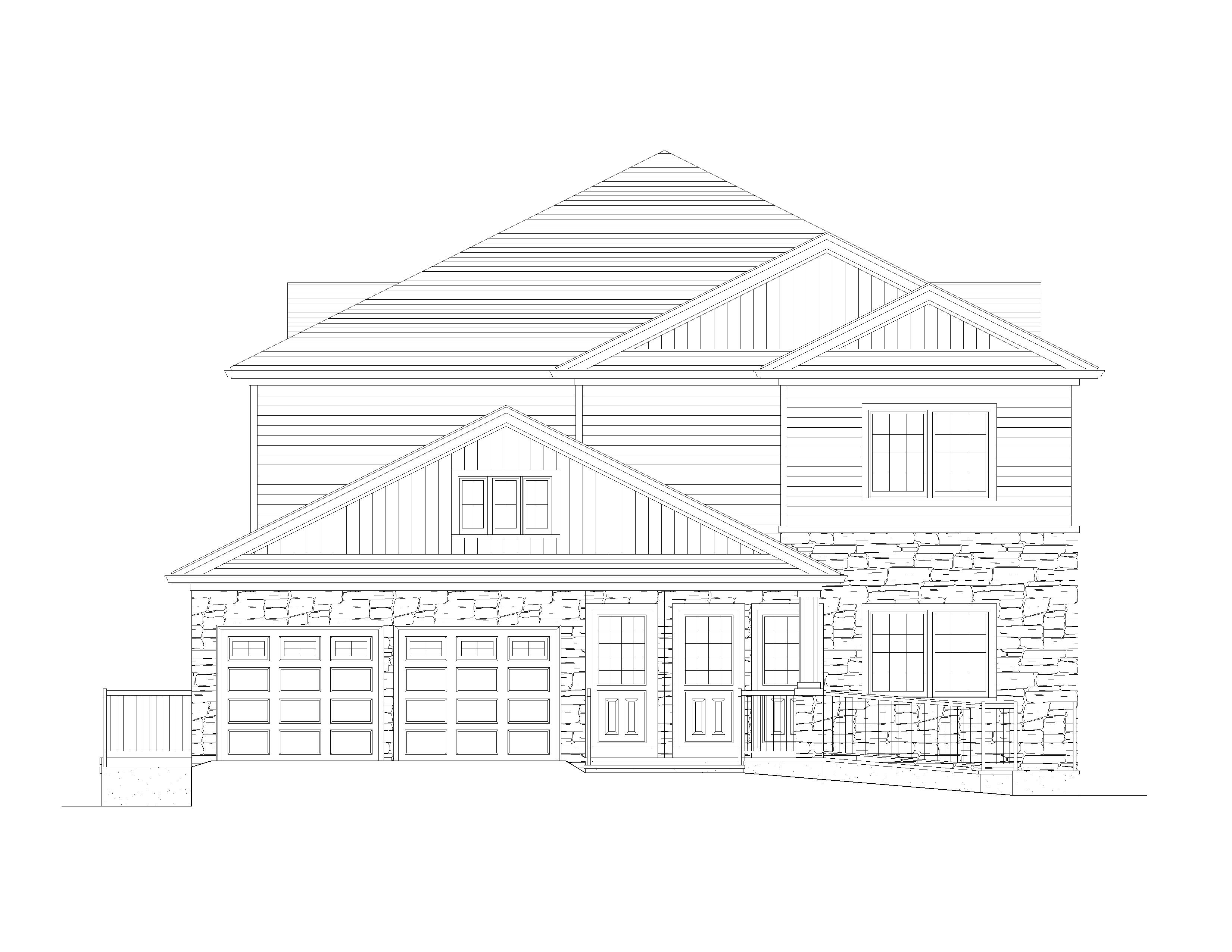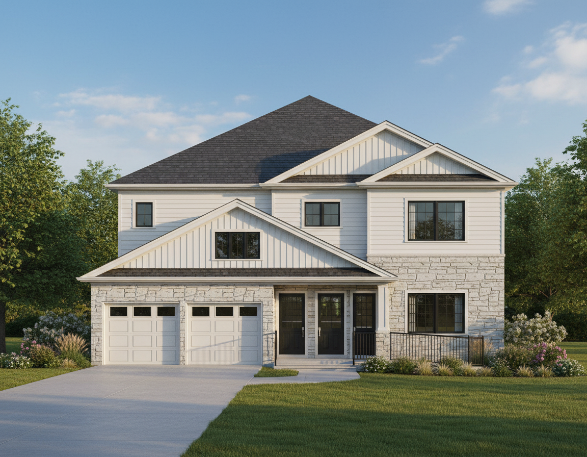 render in warm modern tones modern farmhouse style white board and batten siding and natural stone veneer dark slate roof in a residentail neighborhood with some mature trees show only the existing window locations black framed windows do not add any windows show a driveway leading to the garage and a pathway to the steps mid afternoon sun show the hardie board siding and dark natural stone