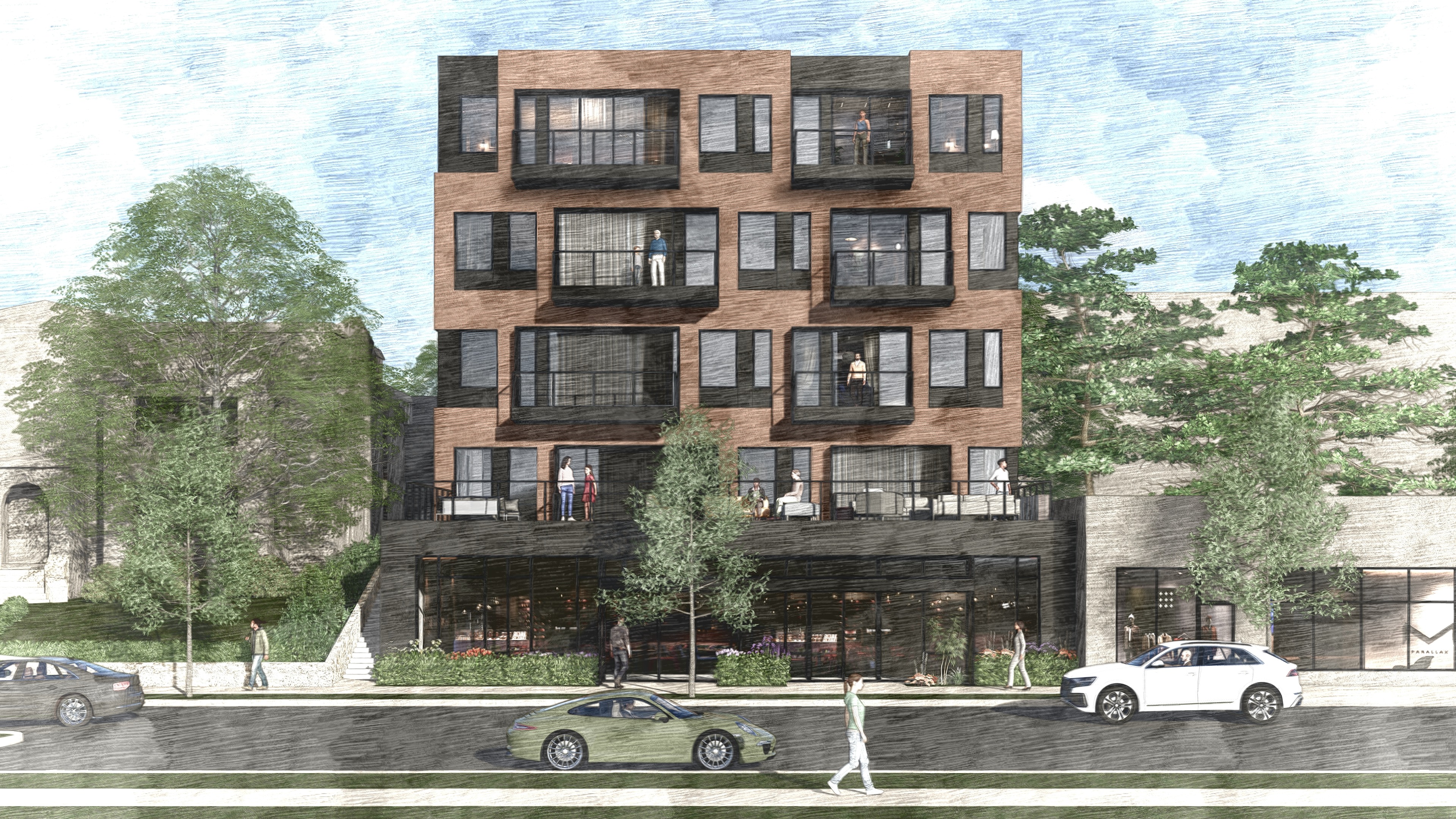 ultra photorealistic modern urban residential exterior professional architectural photography natural daylight with realistic shadows and accurate light direction balanced exposure high dynamic range detailed reddish brick with natural tonal variation and visible mortar depth matte charcoal metal panels with clean sharp edges realistic glass reflections with interior depth realistic street pavement texture natural trees with organic foliage variation remove all people replace cars with realistic high end modern vehicles neutral color grading no oversaturation no sketch effect no illustration style no lumion or enscape look sharp dslr 35mm lens realism timeless elegant editorial architectural magazine style physically accurate materials global illumination realistic light bounce subtle imperfections cinematic depth and clarity