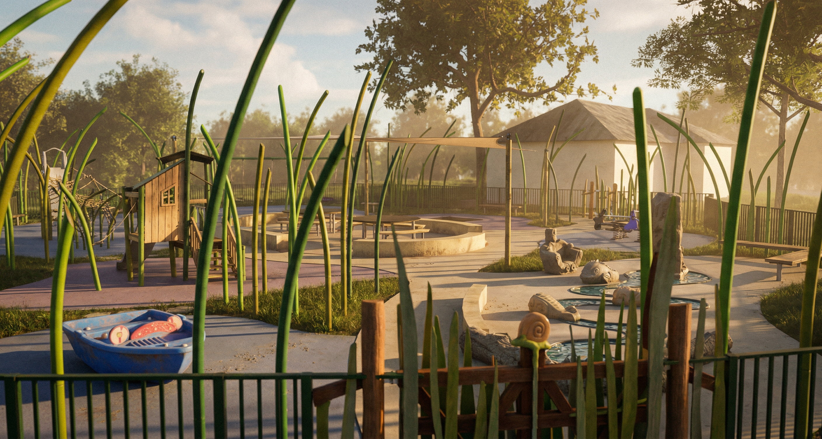 here is the prompt use the uploaded 3d model image as the primary reference create a hyper realistic cinematic ray traced 3d render that looks like a frame from a high budget hollywood feature film preserve perfect scale proportions and surface detail fidelity from the original model apply physically based rendering pbr with global illumination path tracing and real time ray traced reflections and refractions use cinematic lighting with a strong key light subtle rim light and practical light sources in the scene add soft volumetric lighting and atmospheric haze for depth ensure natural light bounce realistic shadow softness and controlled highlights with subtle bloom and no overexposure use ultra detailed materials with accurate albedo roughness metallic and normal maps add micro surface imperfections such as scratches dust fingerprints and realistic wear apply correct fresnel reflections and subsurface scattering where applicable to achieve true photorealism frame the scene with a cinematic camera angle low angle or three quarter view using a 35mm or 50mm lens look apply shallow depth of field with realistic bokeh film style composition following the rule of thirds and subtle motion blur only if the scene implies movement place the model in a believable story driven environment that enhances realism and emotion add cinematic elements like light shafts reflections ambient particles and environmental interaction to make the scene immersive and narrative focused apply professional post processing with filmic color grading cinematic teal orange or neutral lut hdr tonemapping natural contrast curves preserved shadow detail and subtle film grain the final image should appear ultra high resolution 8k look noise free and indistinguishable from real photography final style hollywood cinematic still unreal engine blender cycles octane render quality hyper realistic dramatic immersive physically accurate no stylization no cartoon look no plastic materials add some kids playing on the equipments delete the swing girl in foreground add some adult looking at the kids some intereaction inside the playground where it is lawn at the moment change to some medium height grass shrubs without flowers around 500mm no shrubs under the boat it is color softfall rubber add some parents sitting in the picnic setting under the shade sail