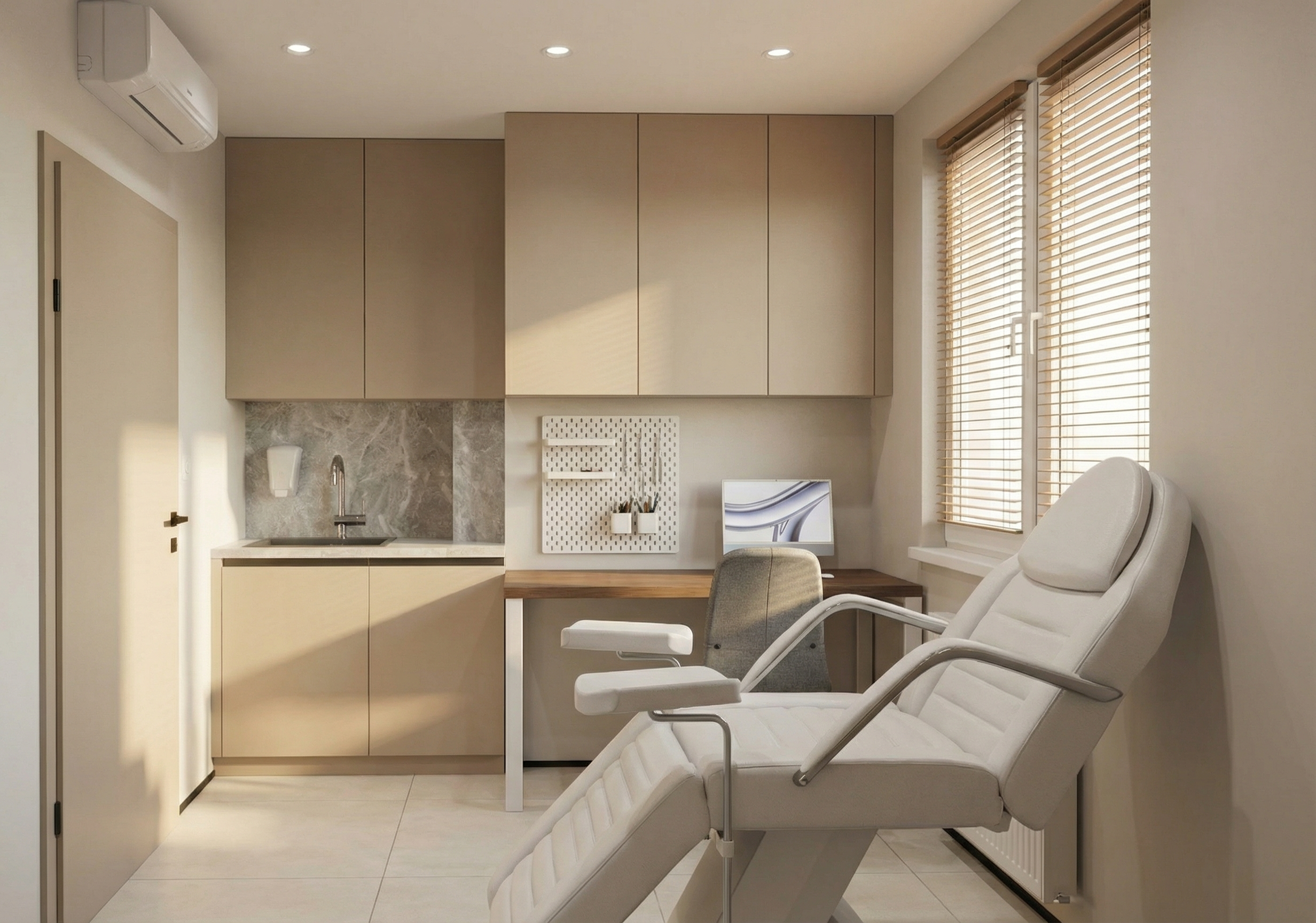 render a sleek modern kitchen with a minimalist design the cabinets are a soft cream color and a rich dark wood offering a warm and inviting feel while the glass cabinets are in dark antracid for a contrasting yet harmonious look the backsplash and countertops are a luxurious matt black granite integrate rich walnut wood on the cabinetry to introduce a natural element complementing the neutral tones ensure the lighting is soft and ambient enhancing the cozy contemporary atmosphere the floor is a light gray concrete providing a clean industrial contrast that maintains the modern aesthetic