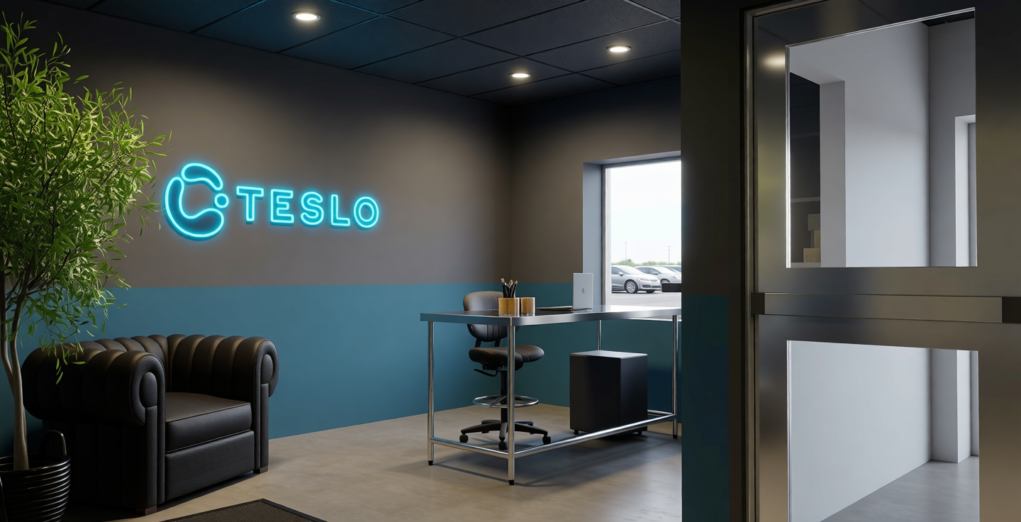 the desk is made of stainless steel the ceiling is made of suspended tiles painted dark gray the floor is matte concrete the carpet is dark gray with a thin black rubber border there is an opening in the wall for passing packages and the only window is on the wall to the left of the desk there is no window on the back wall behind the opening a parking lot is visible through the window the tesla logo on the wall is blue neon install recessed lighting in the ceiling