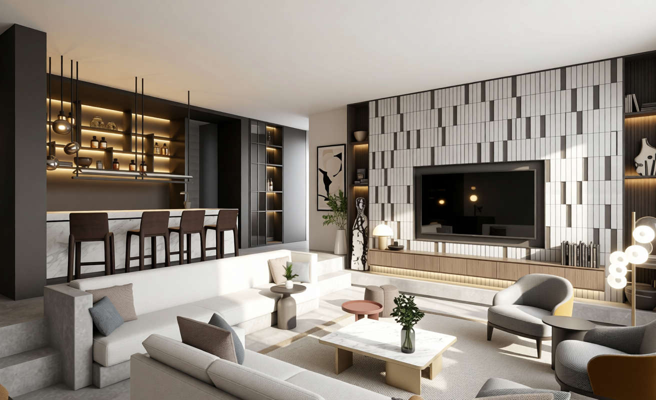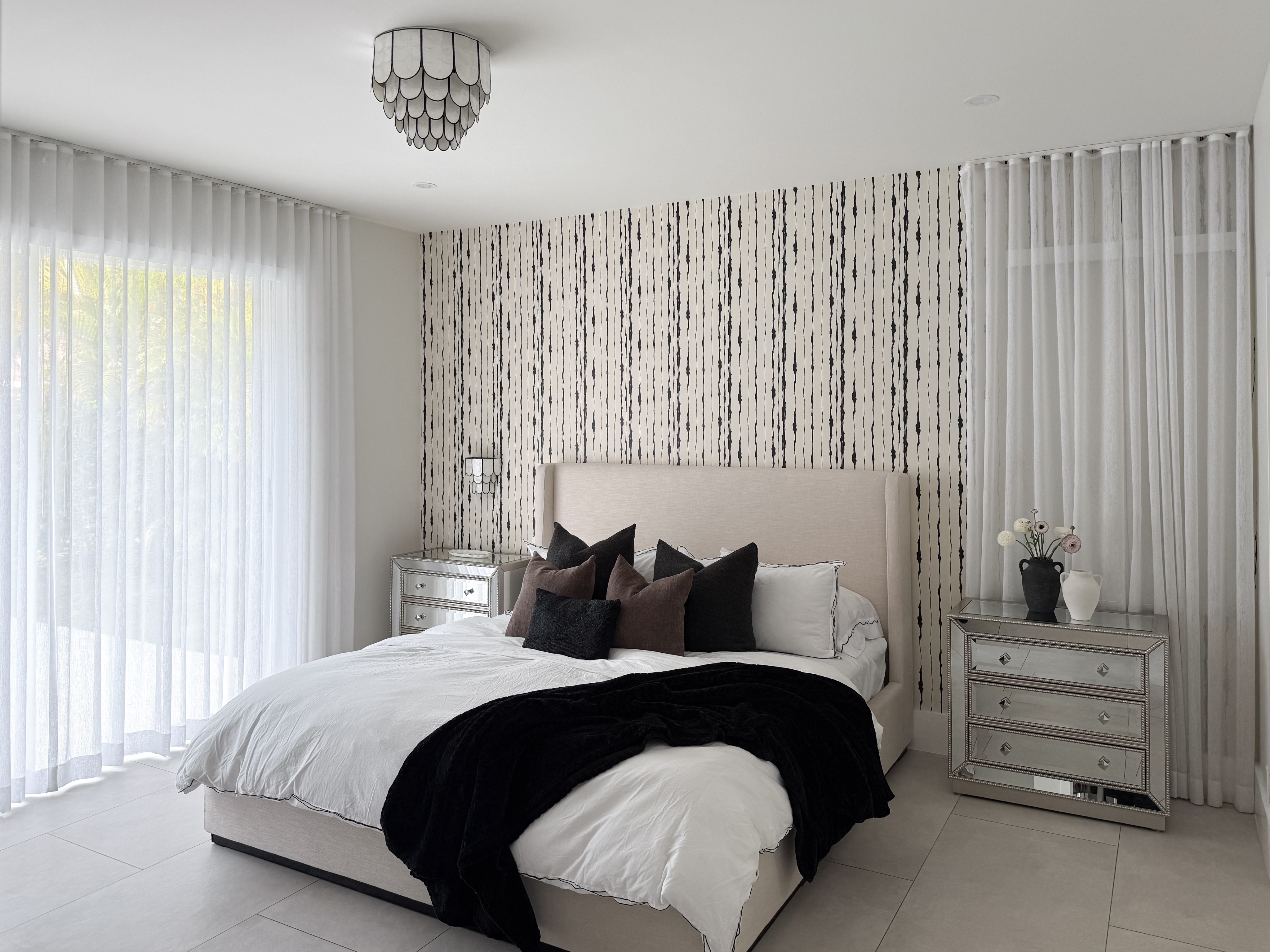 refine and elevate this interior scene into a luxury editorial photograph preserve the existing layout furniture placement and wallpaper design enhance the image with soft warm late afternoon natural sunlight filtering through sheer curtains on the left color palette must remain warm ivory cream sand mocha and soft taupe all whites appear creamy never stark or blue lighting should feel airy luminous diffused and romantic with gentle glowing highlights and soft shadow falloff materials appear plush and couture mirrored furniture softly glowing glass surfaces luminous fabrics and florals delicately sun washed overall mood is calm elegant refined european modern glam photographed like an architectural digest editorial interior photograph ultra high resolution soft film lighting warm color grading creamy highlights no harsh contrast no cool tones no saturation spikes neutral glam romantic luxury couture interior styling shallow natural shadows keep ceiling light off
