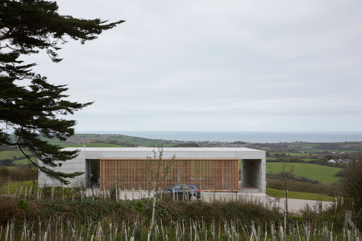 the building facade is maily in classic terracotta bricks but some parts are in dark grey or beige bricks also all the windows are framed in black and the glass reflects a city scape the garage door is in black metal the metal gates are also in black metal the letters on the facade are in dark bronze there are some plants at thebottom of the facade