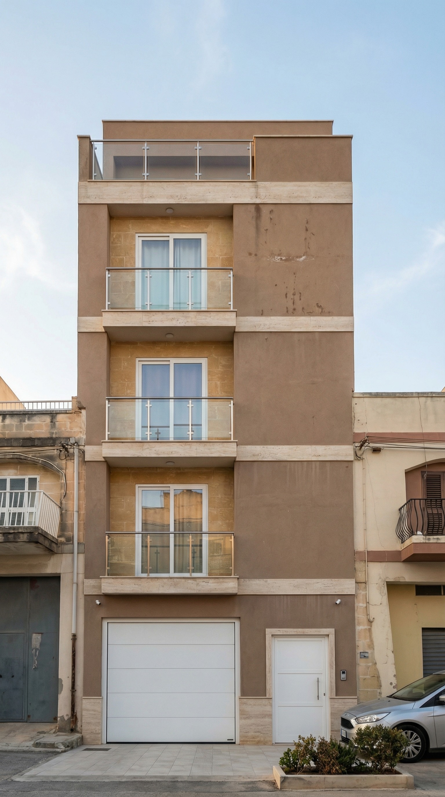 ultra realistic architectural render refinement of the provided image strictly preserve the original image exactly as is same camera angle and composition same geometry and proportions same lighting shadows and surroundings no changes to windows railings doors or context only apply the following change change the main facade finish to a smooth painted masonry rendered plaster in a light off white tone colour direction soft warm off white slight beige undertone not pure white elegant neutral mediterranean feel finish smooth clean and uniform matte with very subtle fine grain no stains no patchiness no weathering keep all travertine elements unchanged horizontal bands and vertical strip remain natural travertine important constraints do not alter travertine colour or texture do not change lighting or contrast do not introduce new materials no redesign or reinterpretation rendering style high end architectural visualization clean refined bright and contemporary mediterranean