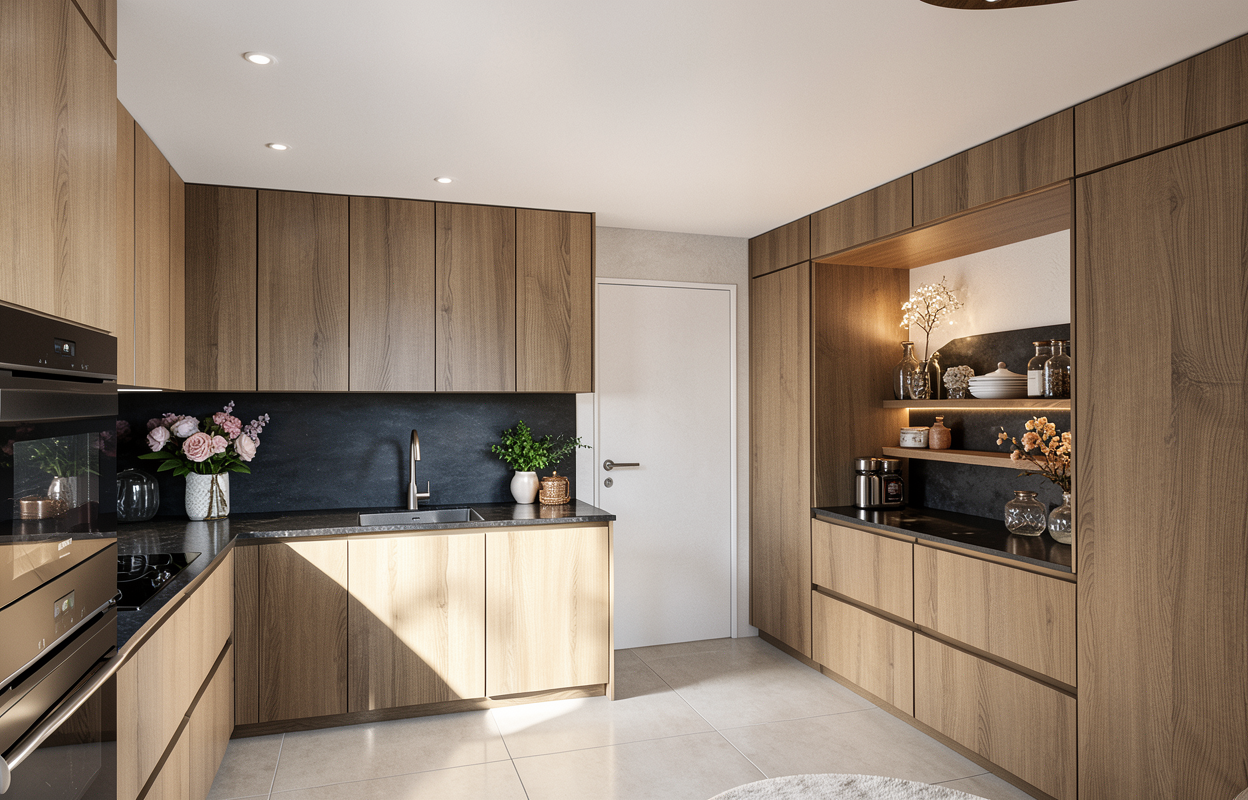 render a modern minimalist kitchen with a soft inviting atmosphere use warm light natural oak tones for the cabinetry and light fixtures with a distinctive intricate design the backsplash and countertop should be a sleek black providing a bold contrast and ensure the overall lighting is soft and ambient to enhance the cozy yet modern feel ad decor