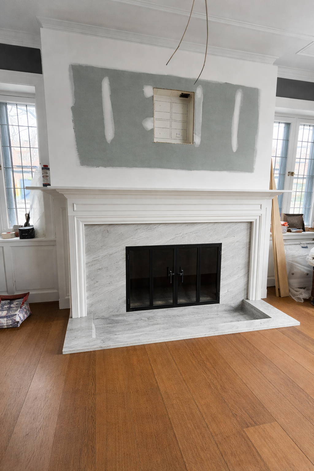 remove stone border at floor and make wood floor a bit darker have wood continue until edge of sunken hearth