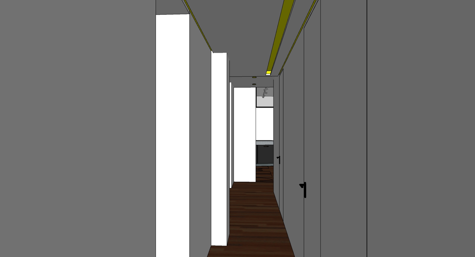 modern minimalist hallway with elegant flush mounted white doors white walls and herringbone parquet flooring flat false ceiling with leds and spotlights soft lighting with ambient and artificial light that create a relaxing atmosphere