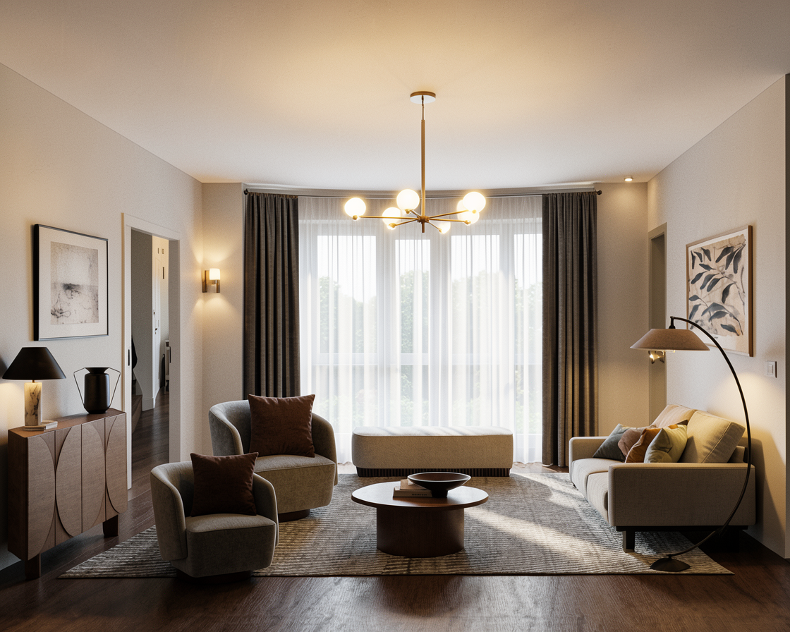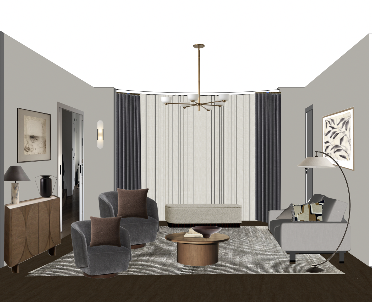 render the image curtains are sheer add light source to the ceiling light the wall sconce and the lamp make the walls medium stone colour