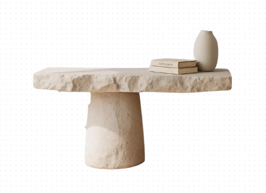 detail shot a low entertainment unit that has a rough hand thrown textured base and rock faced irregular shaped stone surface ideally with concealed doors the base should look stone like i e curve out from the wall