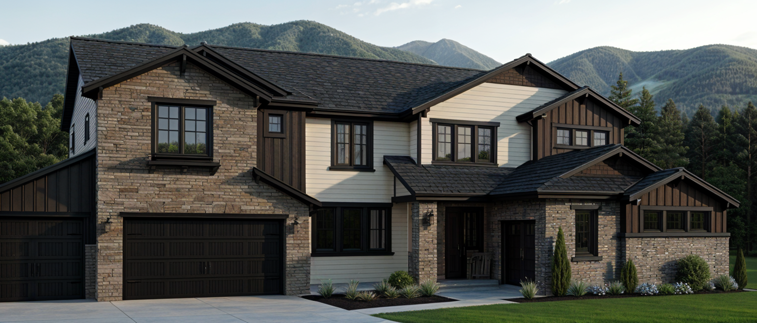 modern exterior shot modern cottage with woods and stone metal roofs over windows and porch otherwise slate roof over main roof modern forest green color architecture