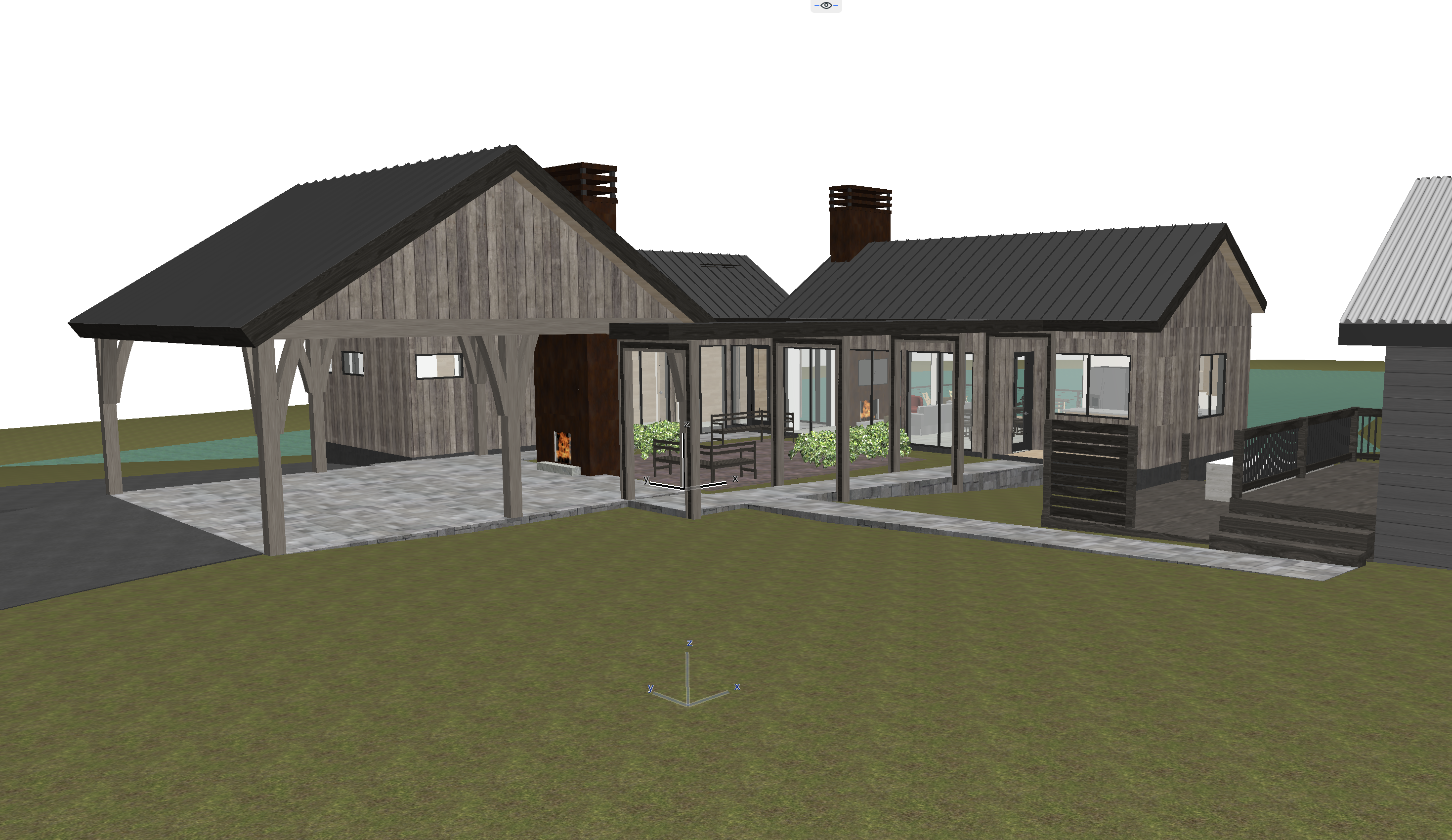 modern farmhouse with covered gathering area in the foreground extensive landscaping with pond behind and visible to the left and right distant trees beyond with rolling tree covered hills in the background