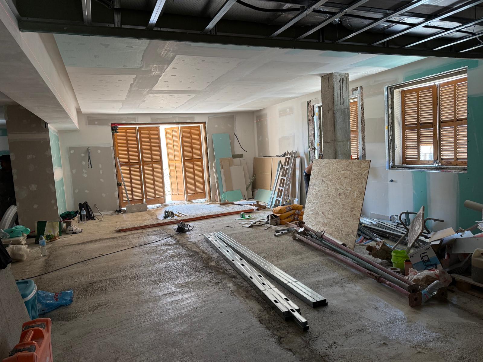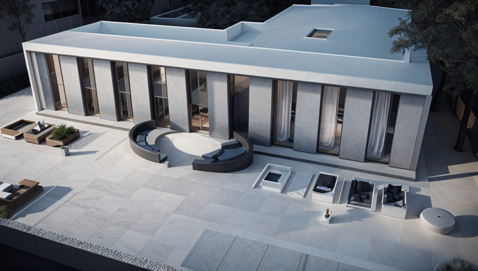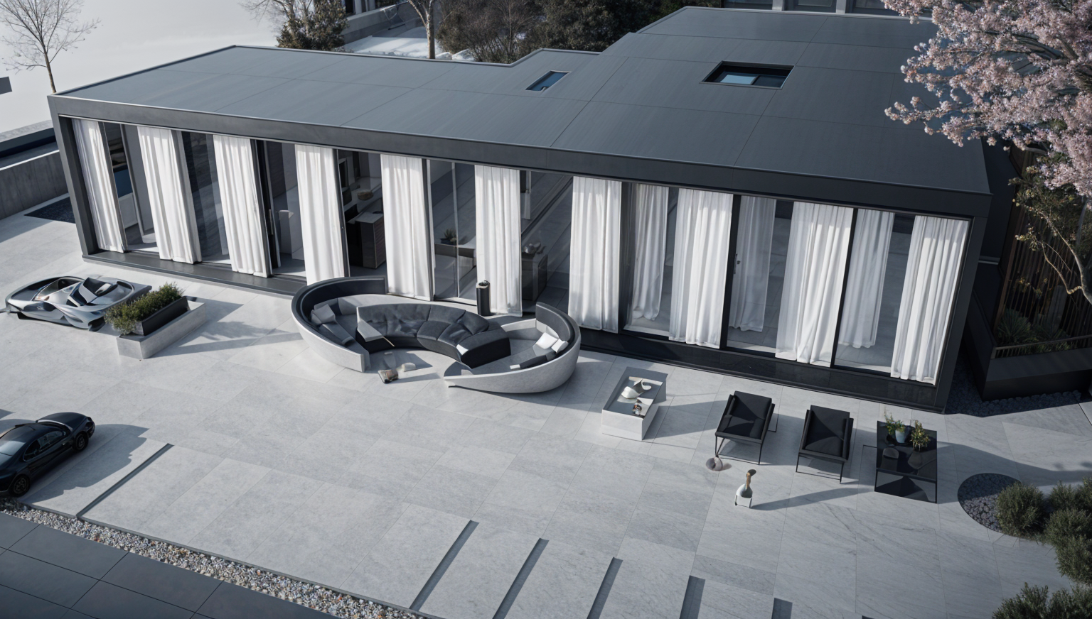 please create a moder fully furnished living room it must have a l shaped sofa in the left hand side a rectangular coffee table in front of it then a tv on the right side must have space to access the outdoor terrace