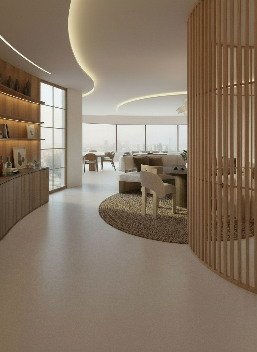 add a porous display shelf behind the banquet seating that curves around it the screen starts from the middle of the banquet seating to the right curving behind it it is made of light coloured timber keep the exact format camera angle and aspect ratio of the original image image must be in landscape format