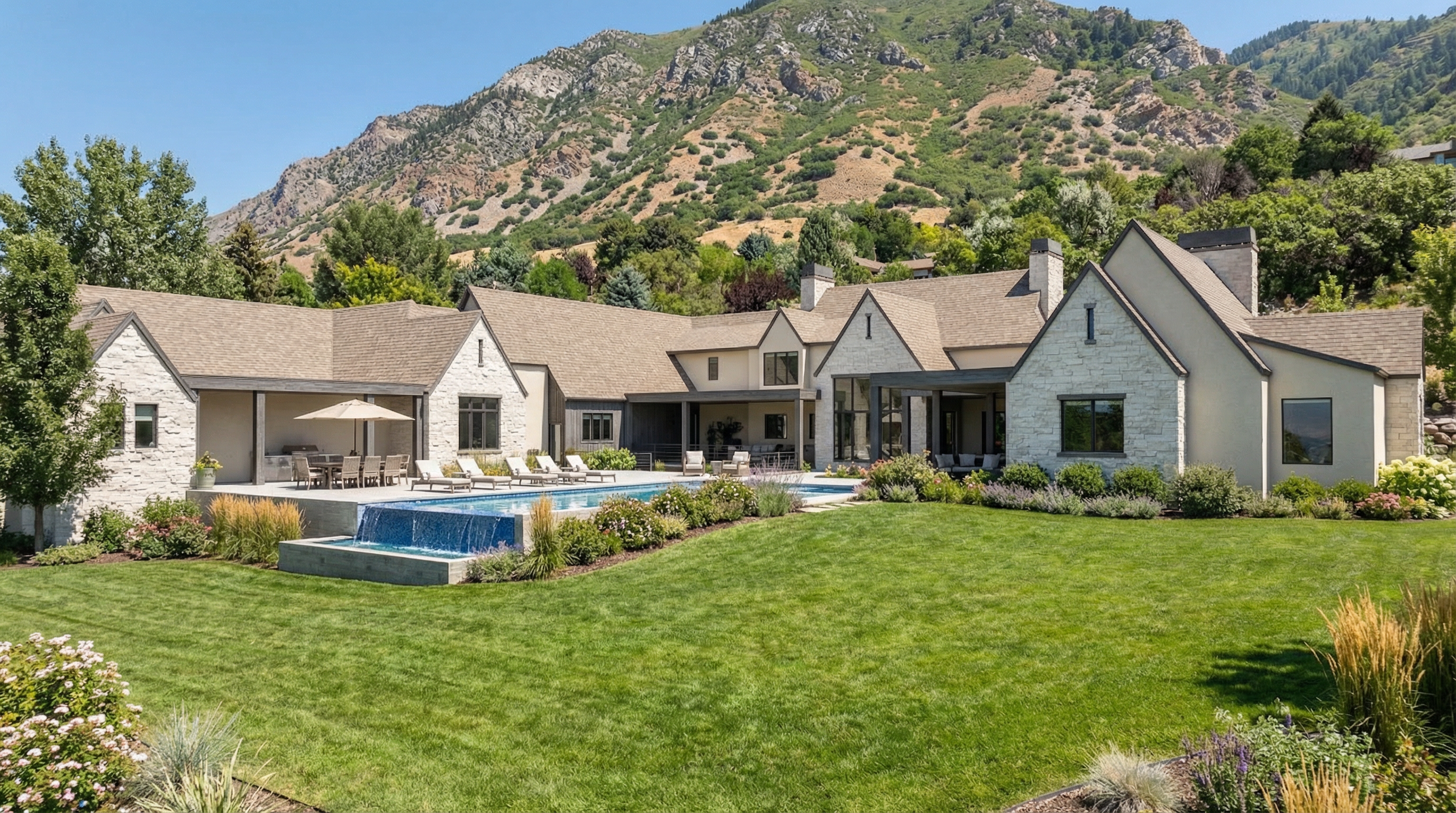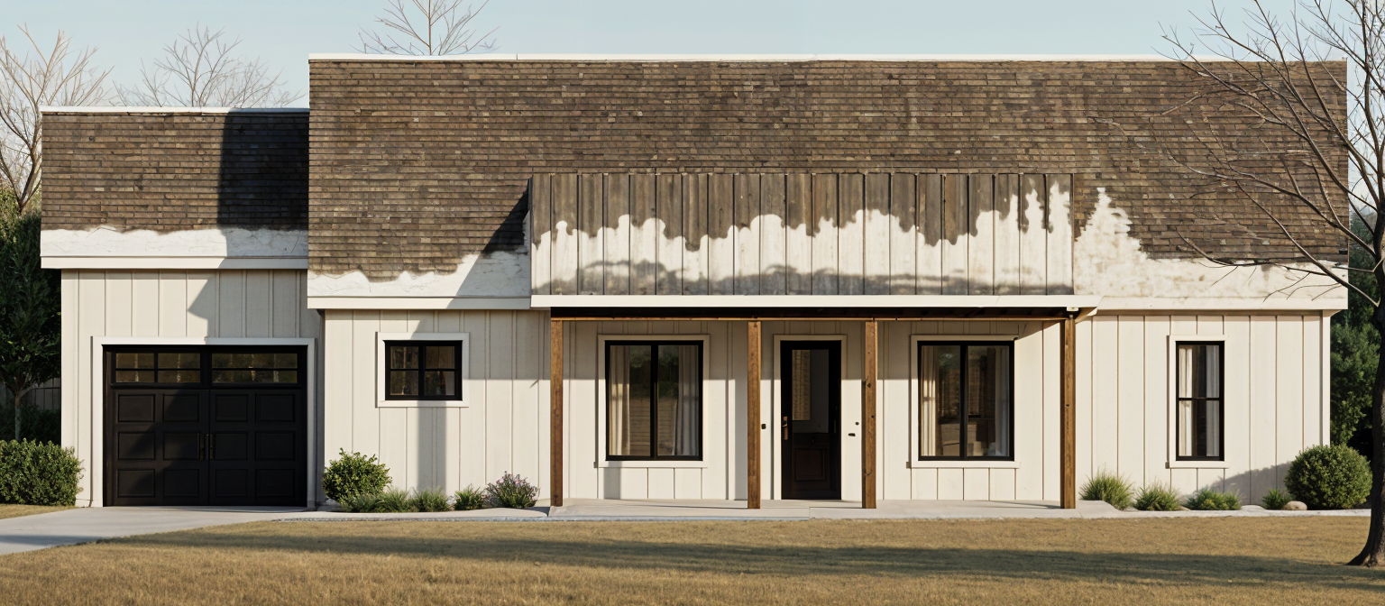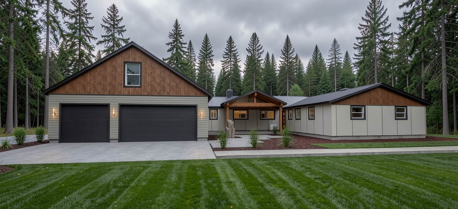 pnw overcast sky tall fir trees in the background manicured lawn keep existing architectural and landscape details lap siding is sage green panel siding is cream