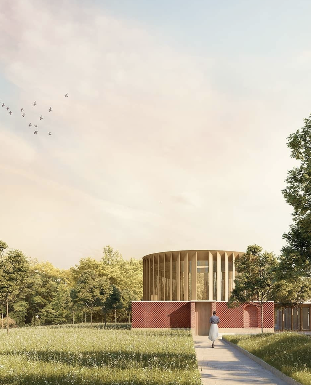 exterior shot curvy building with green walls