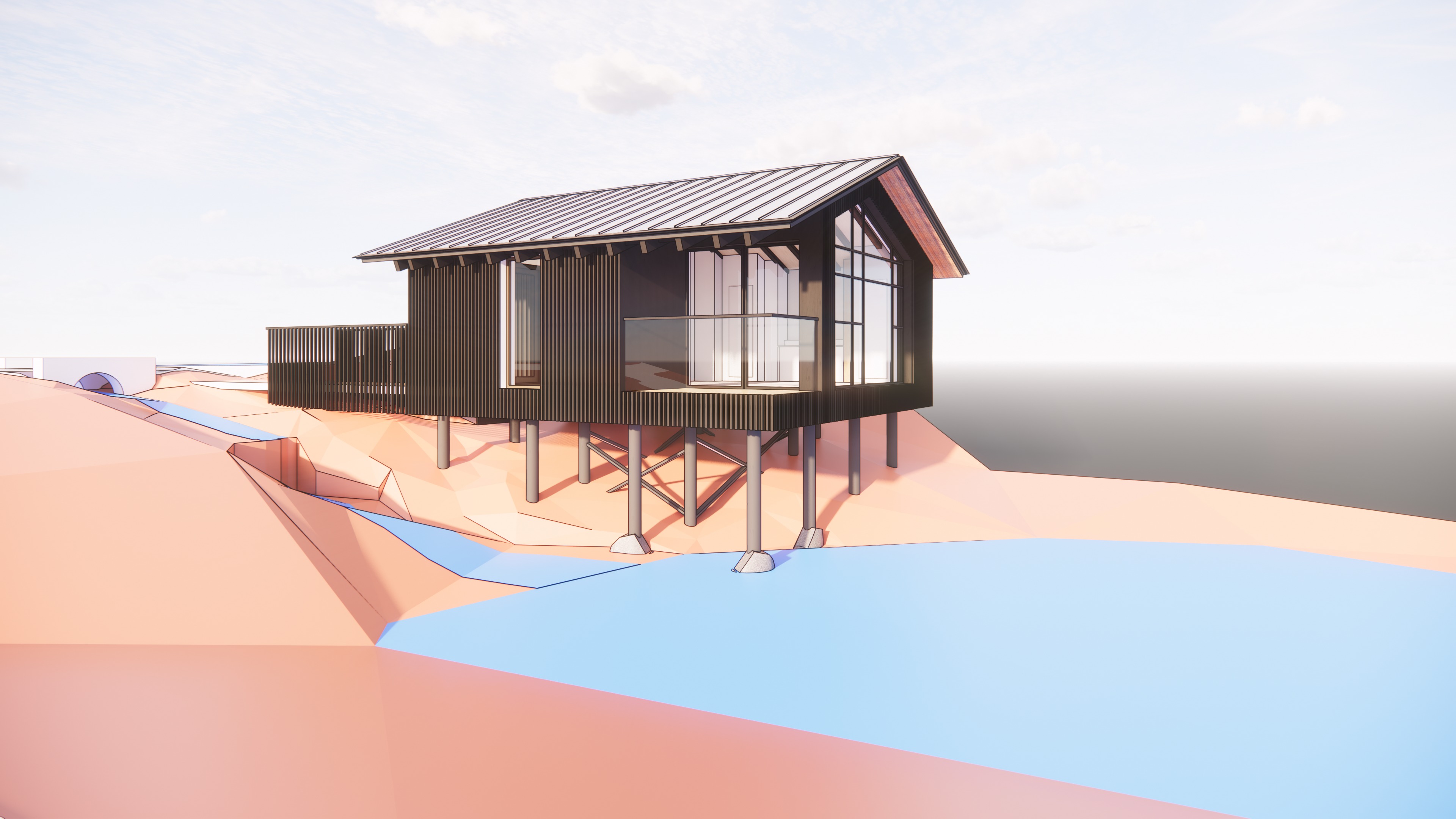 maintain the light to see the details under the roof wal material black burned wood posts forest landscape pond roof is pigmento brown mantein geometry