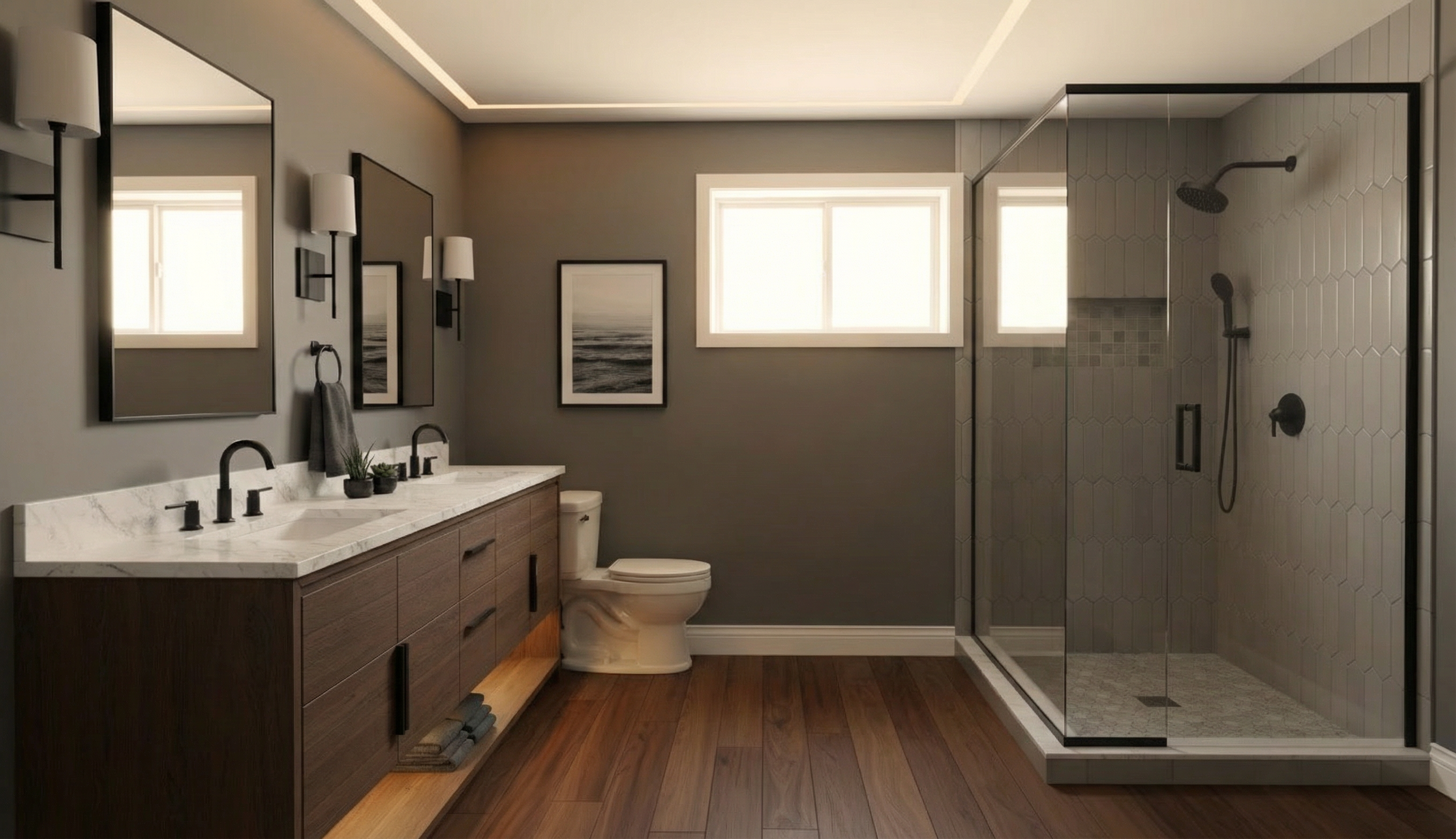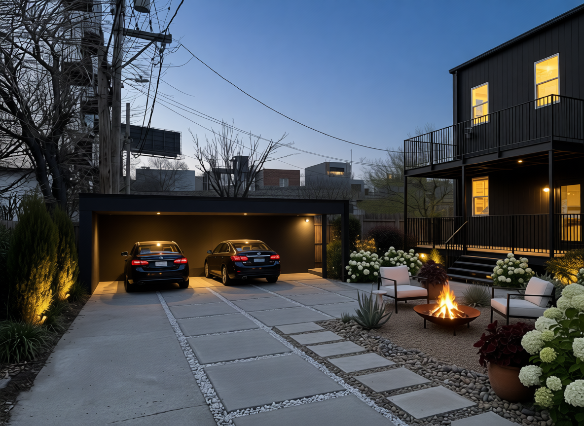 make building black and add two story deck the building on the right and add porsche 911 and tesla under carport