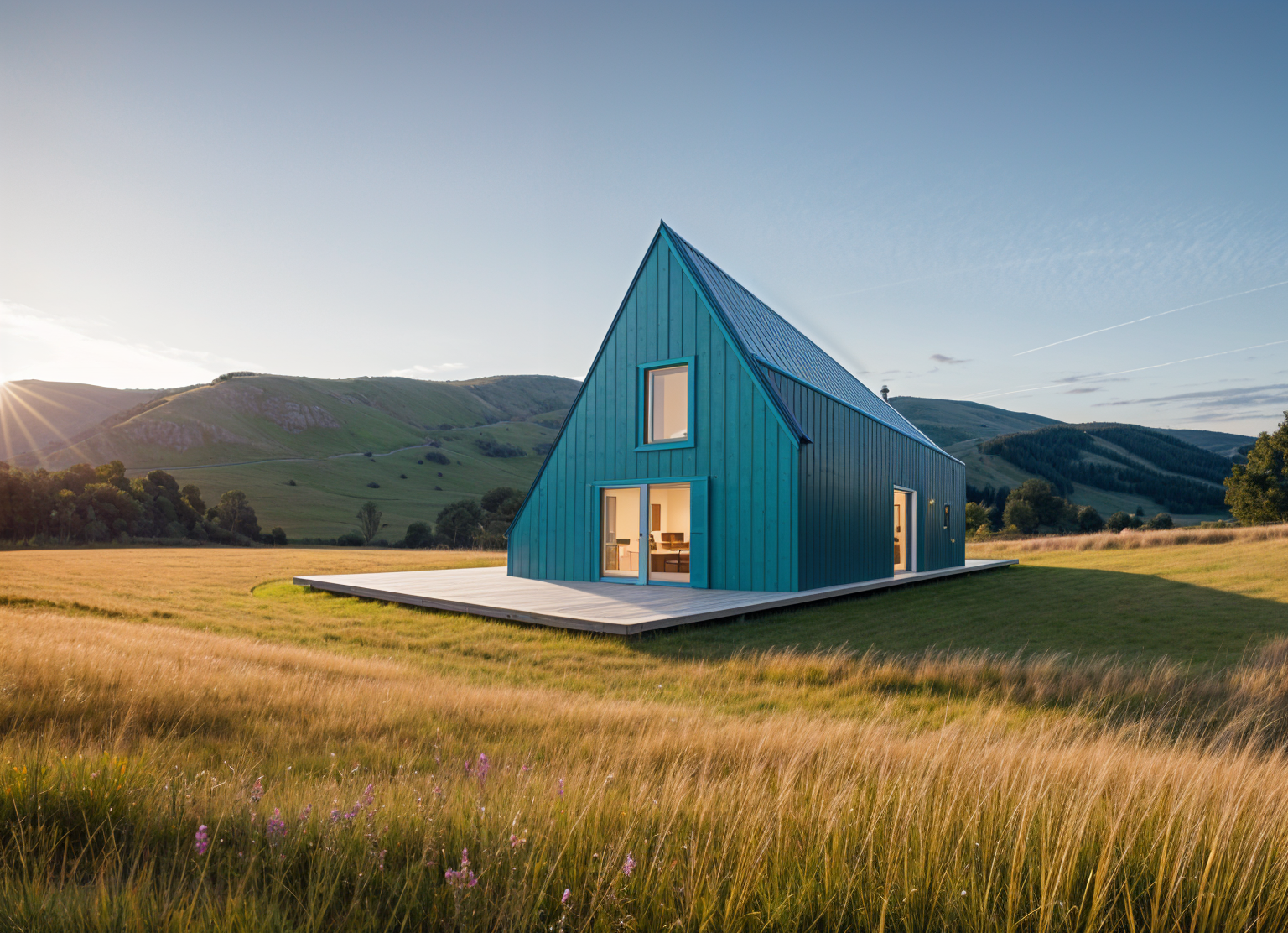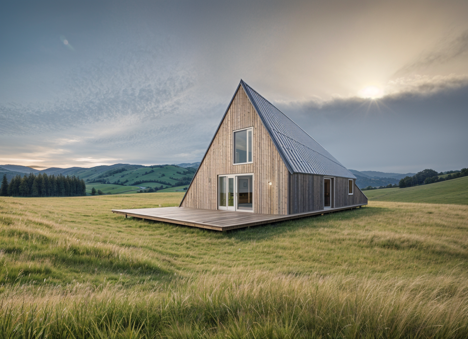 cottage with roof made of corrugated sheet metal and wooden facade on meadow in valley with hills in background architecture