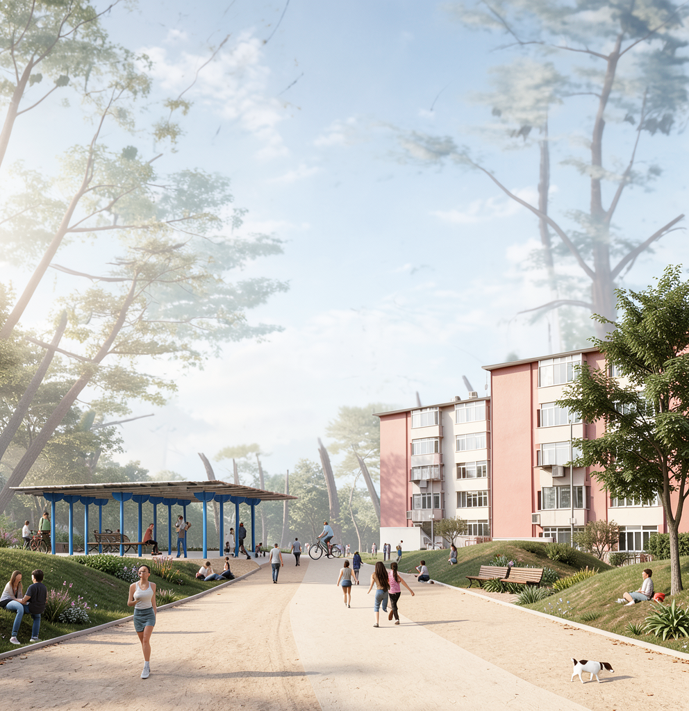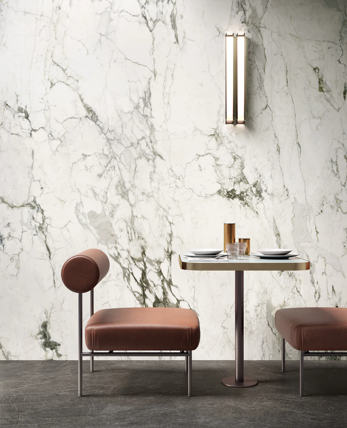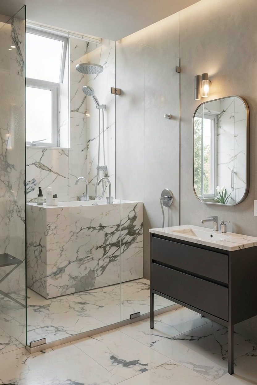 make a modern showerroom styled with the marble from the input photo include a shower glass chrome fittings a dark grey vanity and a square with rounded edge wall mirror the scene needs natural light