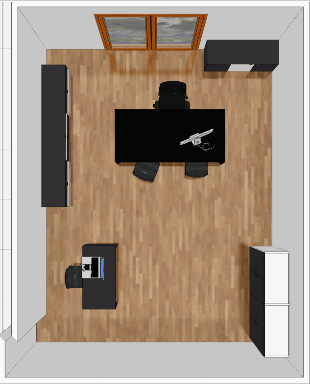 photorealistic modern executive office interior ultra realistic render high resolution premium interior visualization top view bird s eye view orthographic perspective from above keep the exact original layout proportions and furniture placement as in the reference image do not modify structure or composition preserve original colors exactly as shown office furniture in glossy lacquer finish elegant and reflective surfaces modern and minimal design maintain the exact color tones without alteration floor in natural wood parquet warm tone with visible grain realistic texture and soft reflections preserve the original parquet color and pattern exactly add refined decorative elements place two elegant tennis rackets on the low cabinet on the left side arranged in a curated way slightly overlapping or aligned add minimal framed wall art on the walls modern style neutral tones clean and well positioned lighting soft warm natural light late afternoon sunset feeling evenly diffused from the window side soft shadows subtle reflections balanced exposure suitable for top view visualization enhance material realism glossy lacquer reflections detailed parquet texture soft shadows and global illumination create a clean elegant and professional atmosphere not cluttered ultra sharp details clear readability from above premium interior design visualization luxury executive office mood