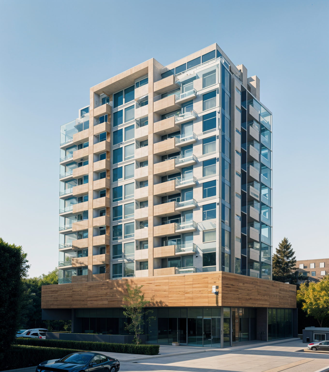 modern exterior shot add landscaping with decorative trees shrubs and parking lot add trees in background add people walking in foreground architecture