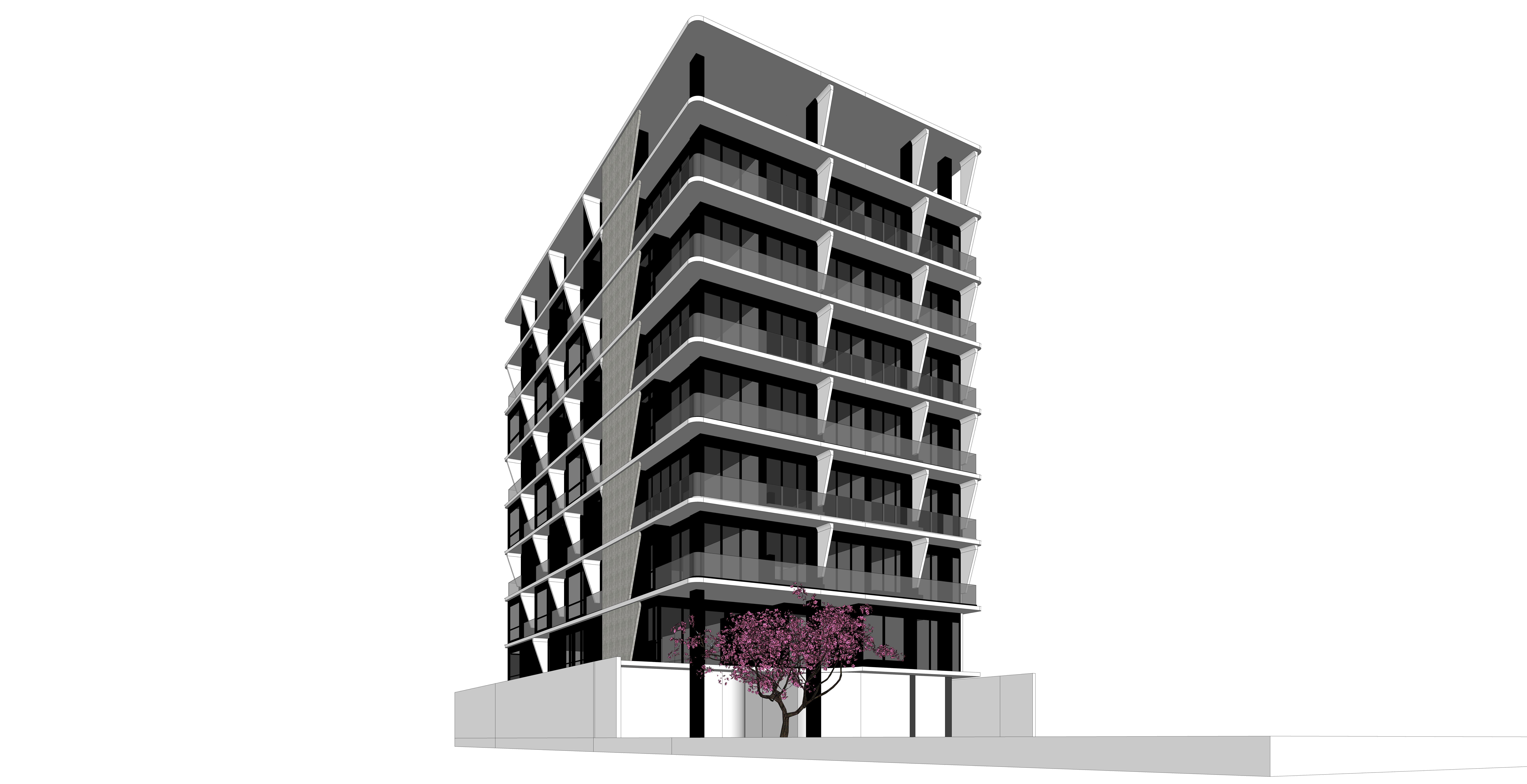 render a modernist architectural building with sleek angular lines use a palette of light gray for the concrete deep charcoal for the window frames and reflective glass the building should stand in an urban landscape with a clear blue sky and warm sunlight to create a bright and inviting atmosphere add subtle shadows for depth and dimension highlighting the building s geometric design