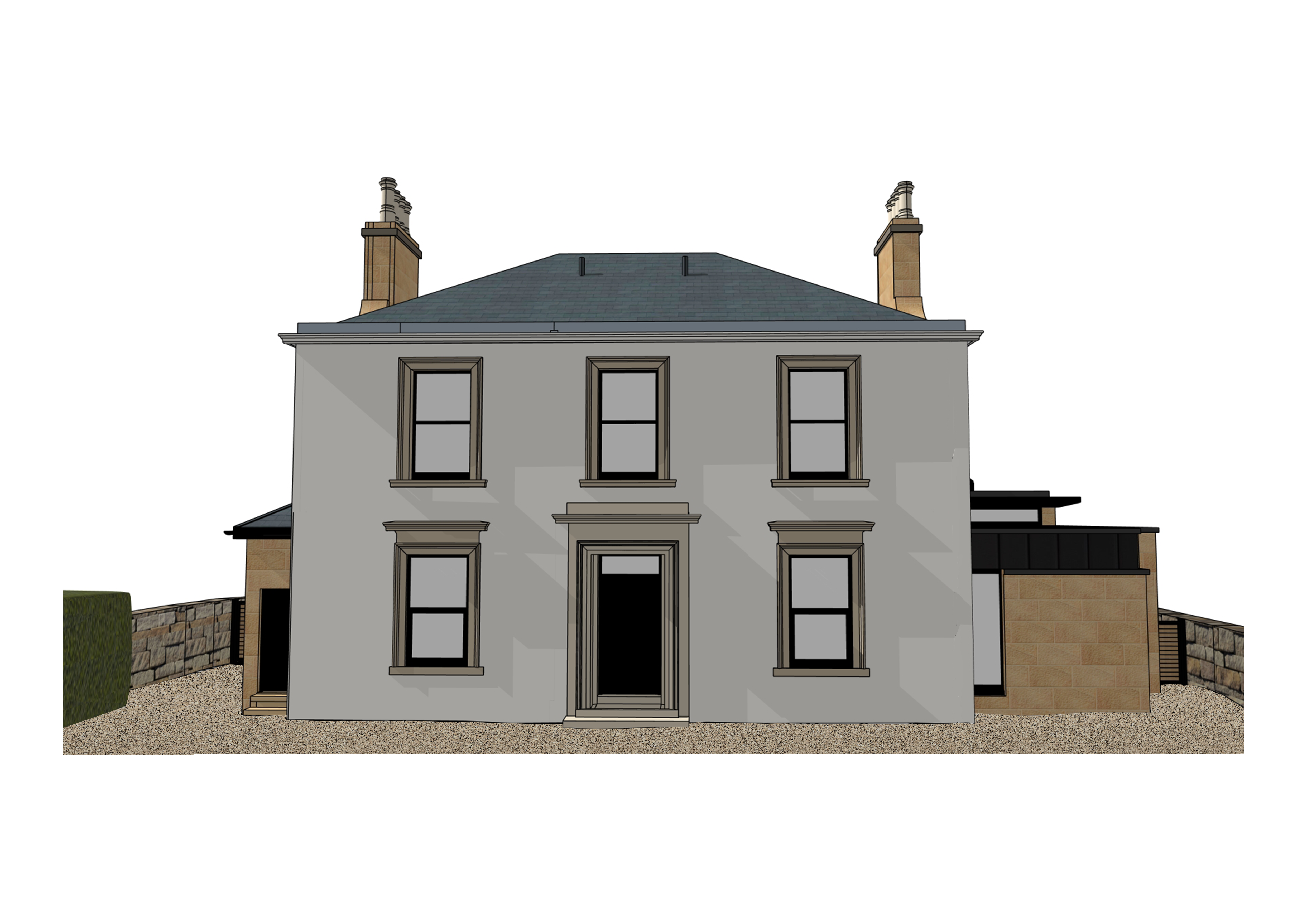 external architectural render of a house and extension preserve all original materials geometry perspective proportions and layout exactly as modeled enhance realism with refined textures improved lighting and subtle surface detail do not add any new elements beyond what appears in the current model no additional trees vegetation buildings or environmental context replace background with clean blue sky only add soft diffused glow inside windows to emphasise transparency and internal light maintain minimal composition archsynth photoreal style