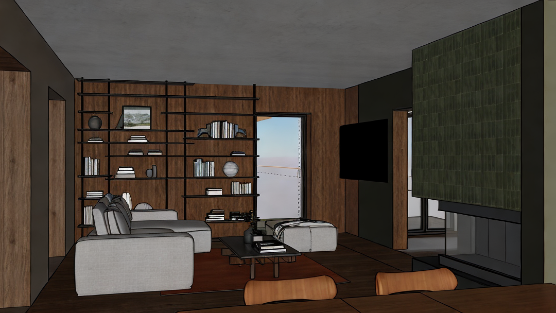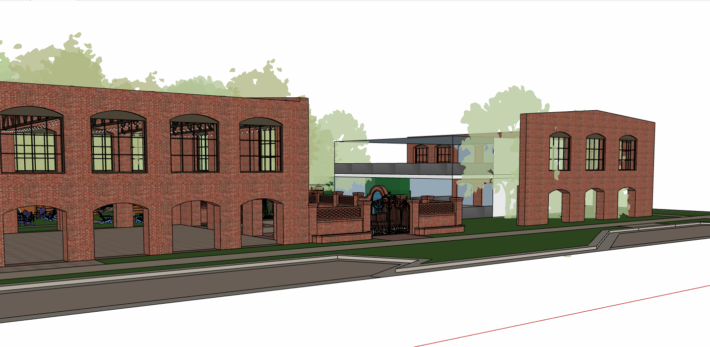 make this a photorealistic rendering of actual buildings in early afternoon light with lights on every brick column of the buildings make the white box a modern steel and glass building with large first and second floor patios put patio furniture on the first and second floor patios put lush landscaping between the brick walls and the white box building put angled parking at the street make columns that run from the first floor to the second floor and support the second floor roof make the walls that lead out to the patio modern all glass with black metal frames on the glass keep brick on the wall with arch windows furthest to the right in this image