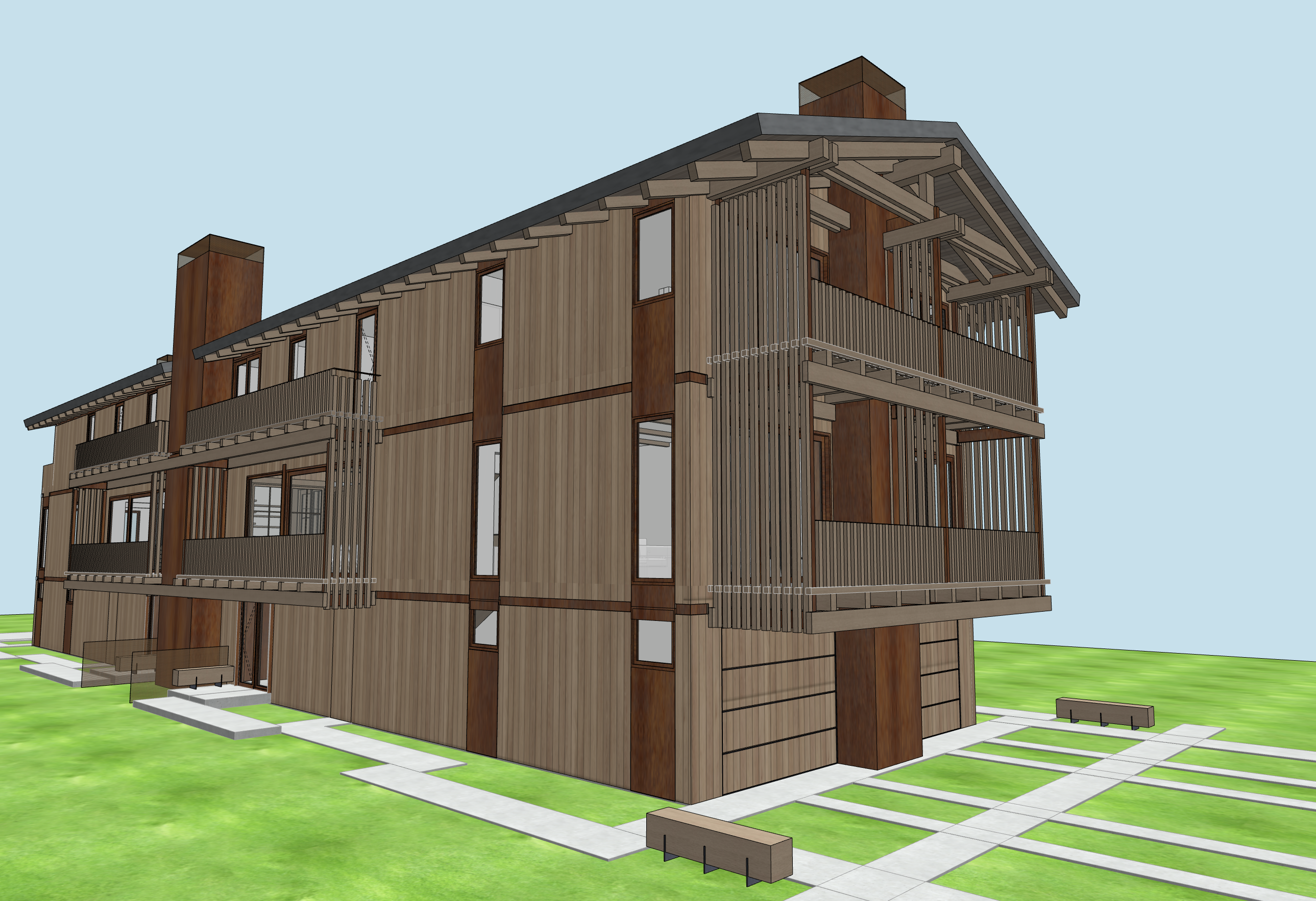 a modern beautiful wooden house with a sloped roof use warm natural shades of brown for the wood and deep chestnut for the accent beams the roof should be a slate gray large windows with reflective glass the house sits on a lush vibrant green lawn with a light stone colored path leading up to it set against a clear bright blue sky the atmosphere is peaceful and contemporary