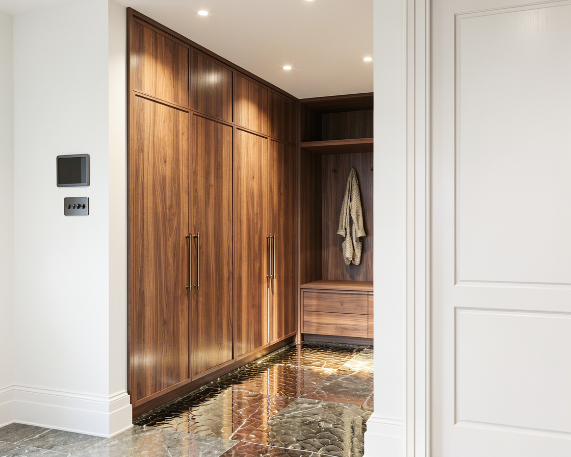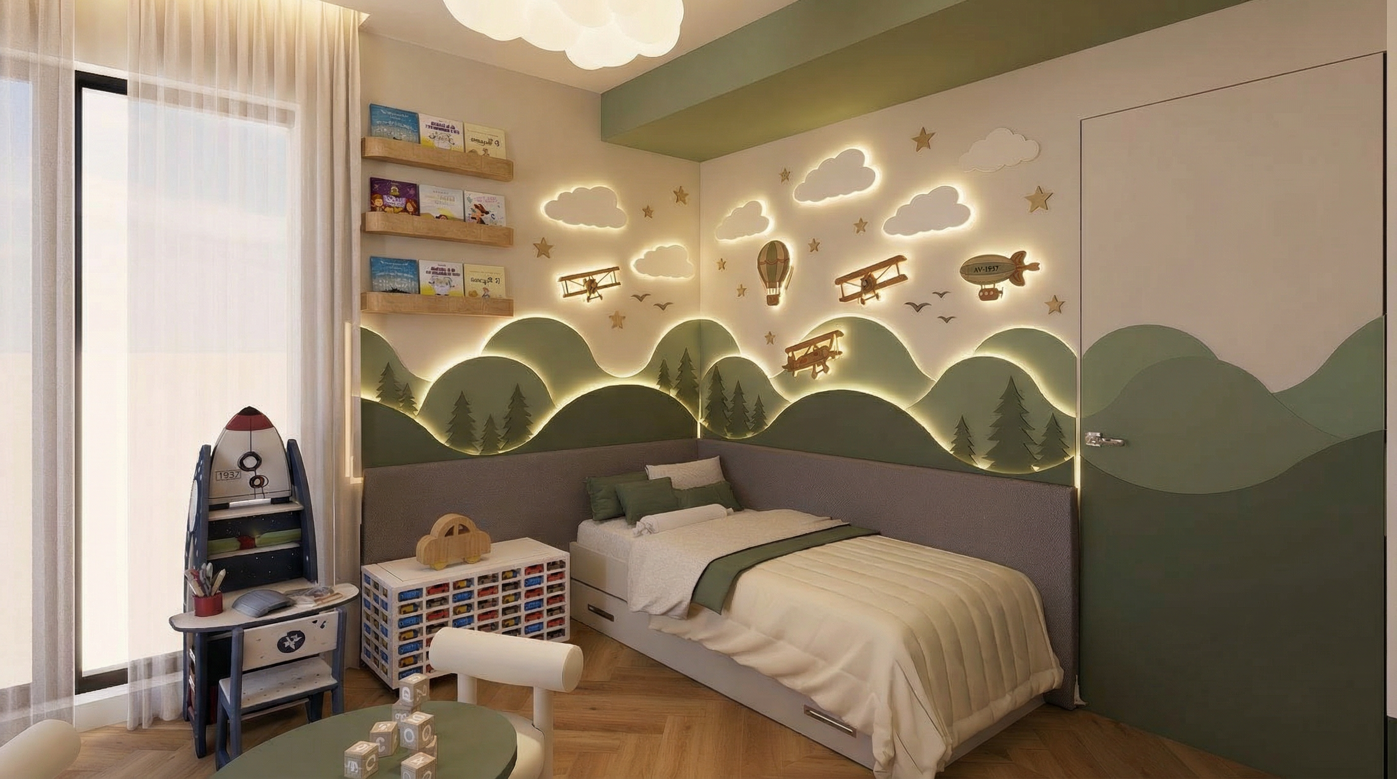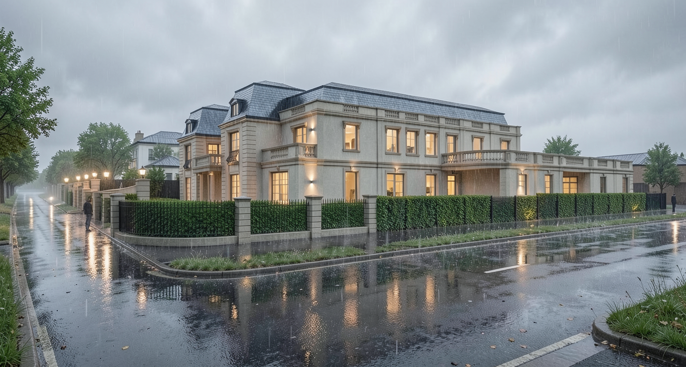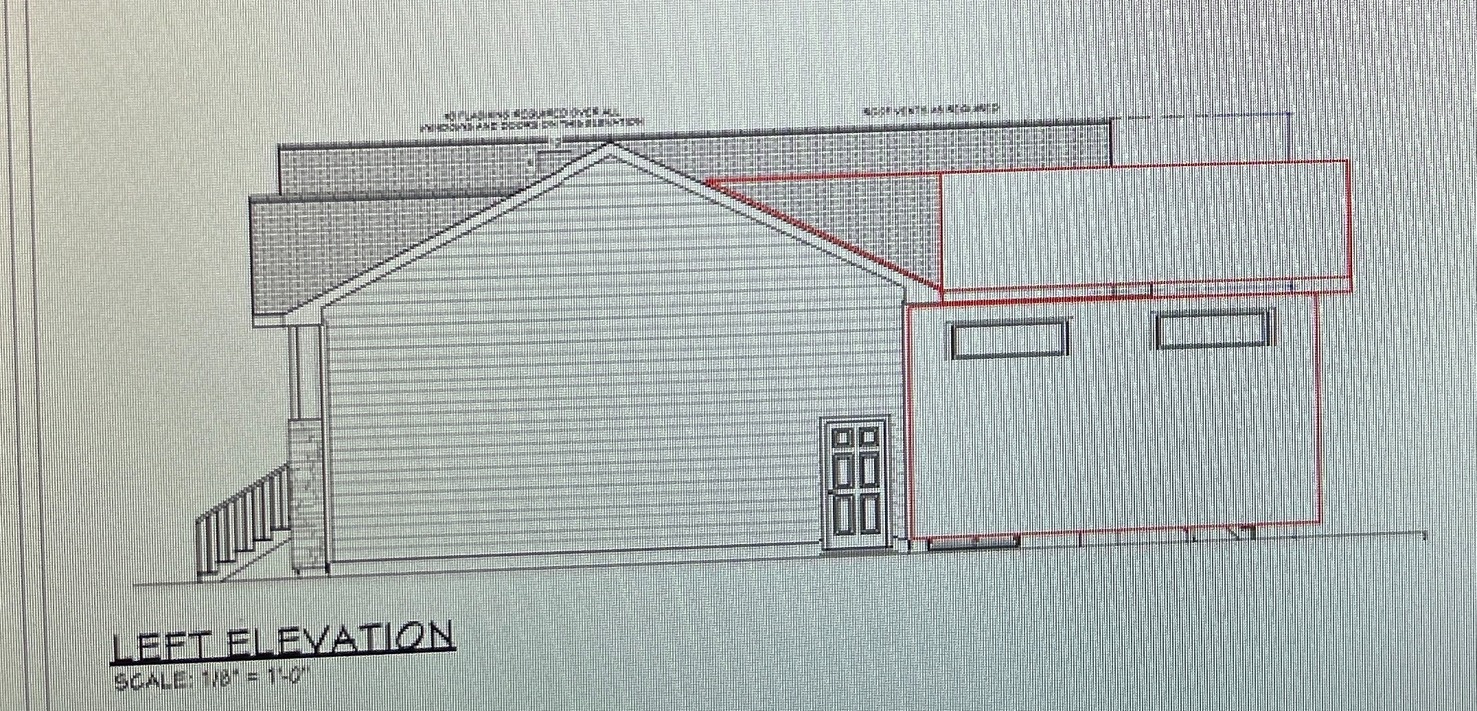 exterior shot render a modern house design with a detailed elevation view the main building should have a soft gray siding with subtle texture the roof should be a dark charcoal gray providing a sleek contrast highlight the trims and lines with muted red accents for definition the door should be a classic wooden brown with elegant detailing surrounding the house create a serene atmosphere with soft natural lighting suggesting late afternoon include minimalistic landscaping with green shrubs and a clean pathway the overall atmosphere should evoke a cozy yet contemporary suburban home