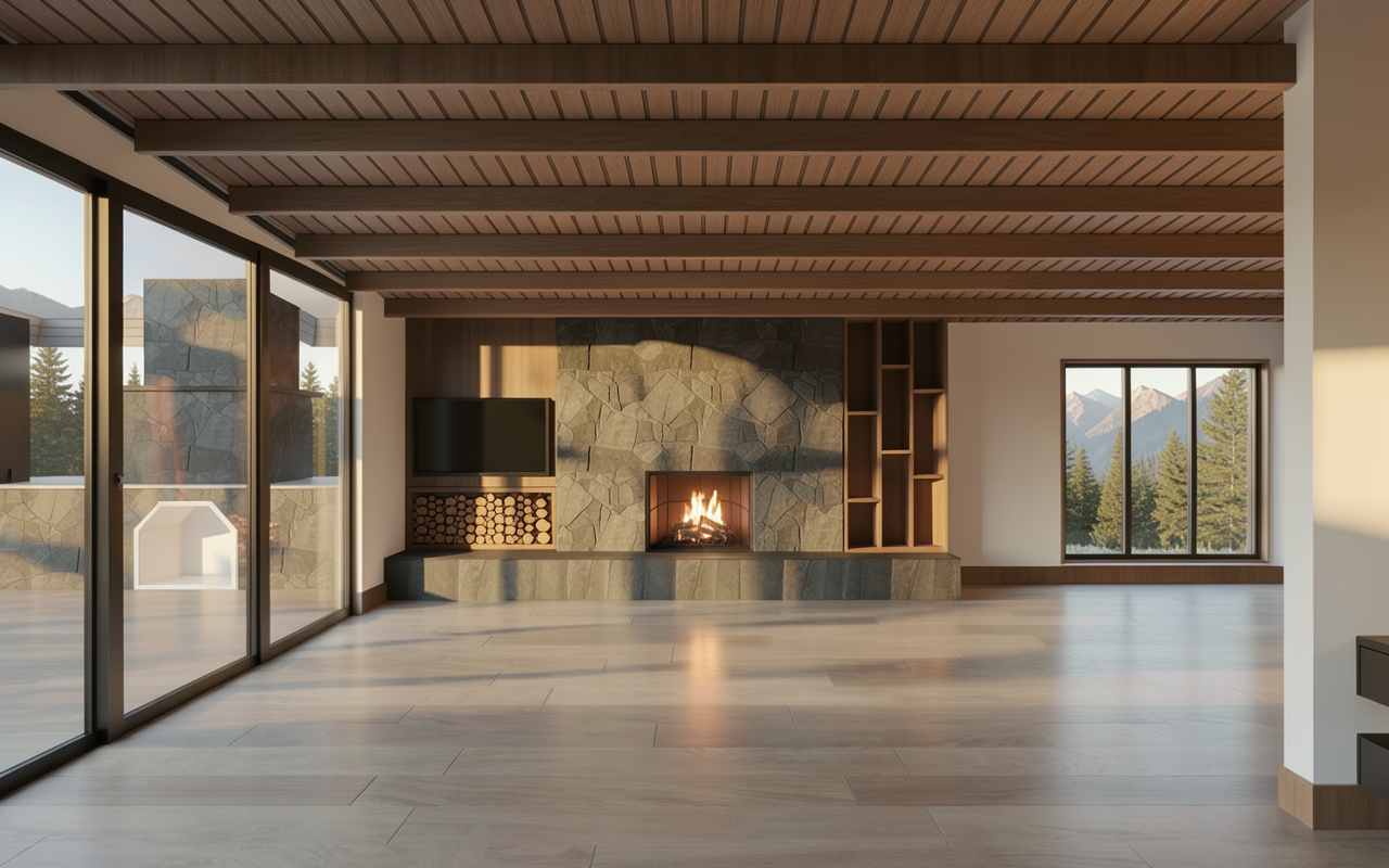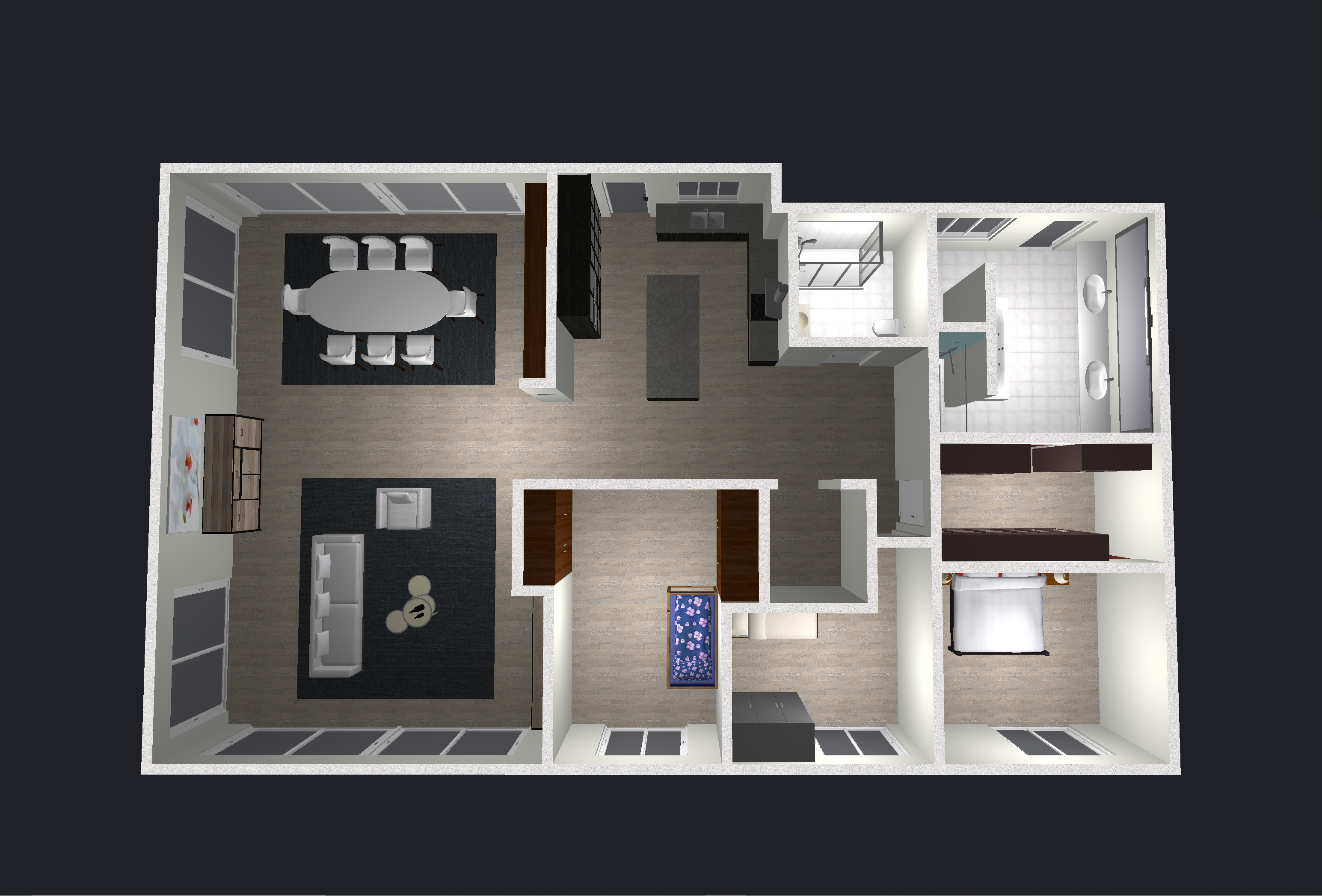 genau dieses rendering berarbeiten fotorealistisches innenraum foto exakt dieselbe perspektive und kameraposition wie das hochgeladene referenzbild 100 identische raumgeometrie exakt gleiche m belanordnung exakt gleiche verlegeart und richtung von platten und parket wie vorlage exakt identische fensterpositionen mit gleichem ausblick durch die fenster das bad oben rechts hat plattenbelag mit beigem marmor die dusche oben rechts hat ebenfalls beiger plattenbelag weiches nat rliches tageslicht leicht schr g einfallende sonne durch die grossen fenster zus tzlich alle r ume k nstlich hell ausleuchten sanfte realistische schatten blickrichtung ist nach norden sonnenlicht kommt von s den deckenbeleuchtungen in den r umen anbringen realistische materialien echte holztexturen stoff mit leichten gebrauchsspuren hochwertige oberfl chenreflexionen kleine gr npflanzen bilder an weissen innenw nden blumen in vasen auf tischen einbauen alle m bel ersetzen mit designerm bel alle fenster mit hellbeigen transparenten vorh ngen ganzer grundriss freistellen und hintergrund anthrazit mit reflektionen nat rliche farbwiedergabe leicht warme farbstimmung golden hour feeling das bild muss wie eine professionelle fotografie aussehen es soll ein echtes und reales foto sein canon eos r5 35 mm festbrennweite f 2 8 hyperrealistisch dslr qualit t raw aufnahme 8k aufl sung extrem scharf perfekte tiefensch rfe professionelle architekturfotografie